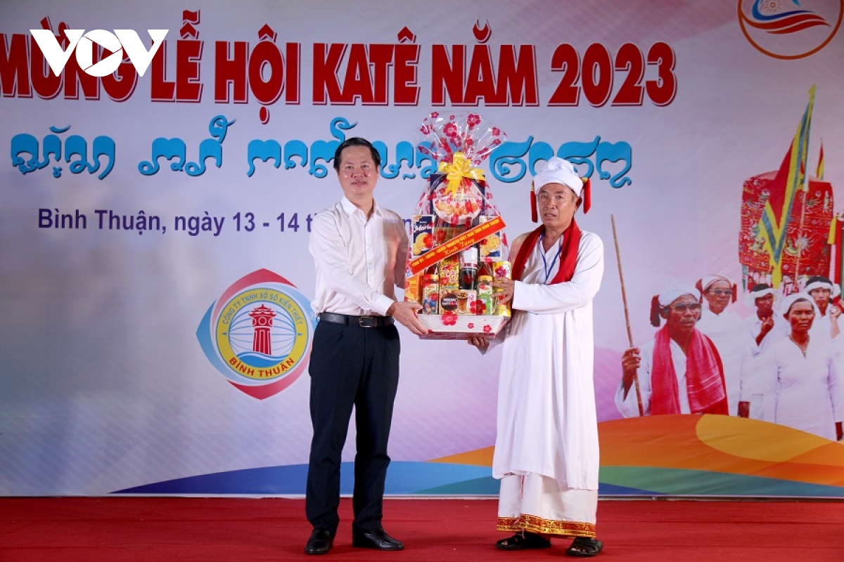 Đại diện Ban Tôn giáo Chính phủ tặng quà chúc mừng Lễ hội Katê năm 2023 tại tháp Pô Klong Garai ở Ninh Thuận |