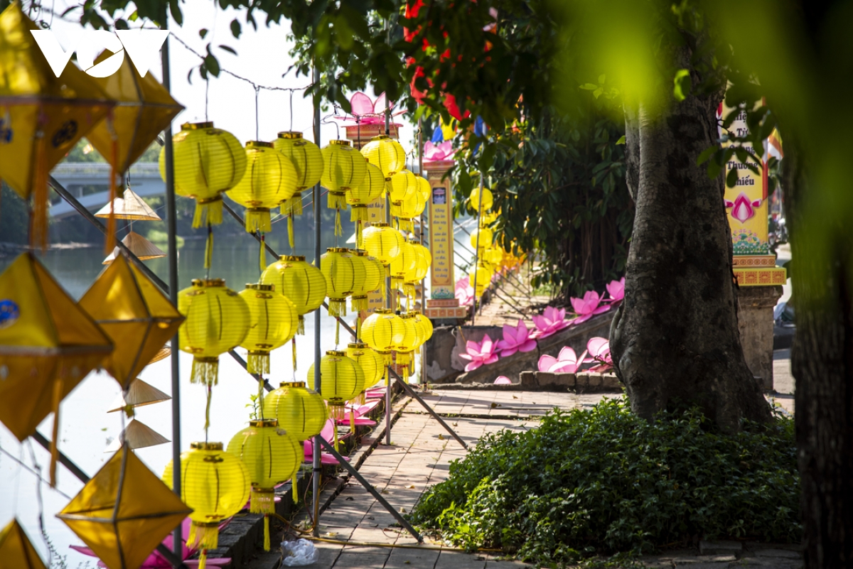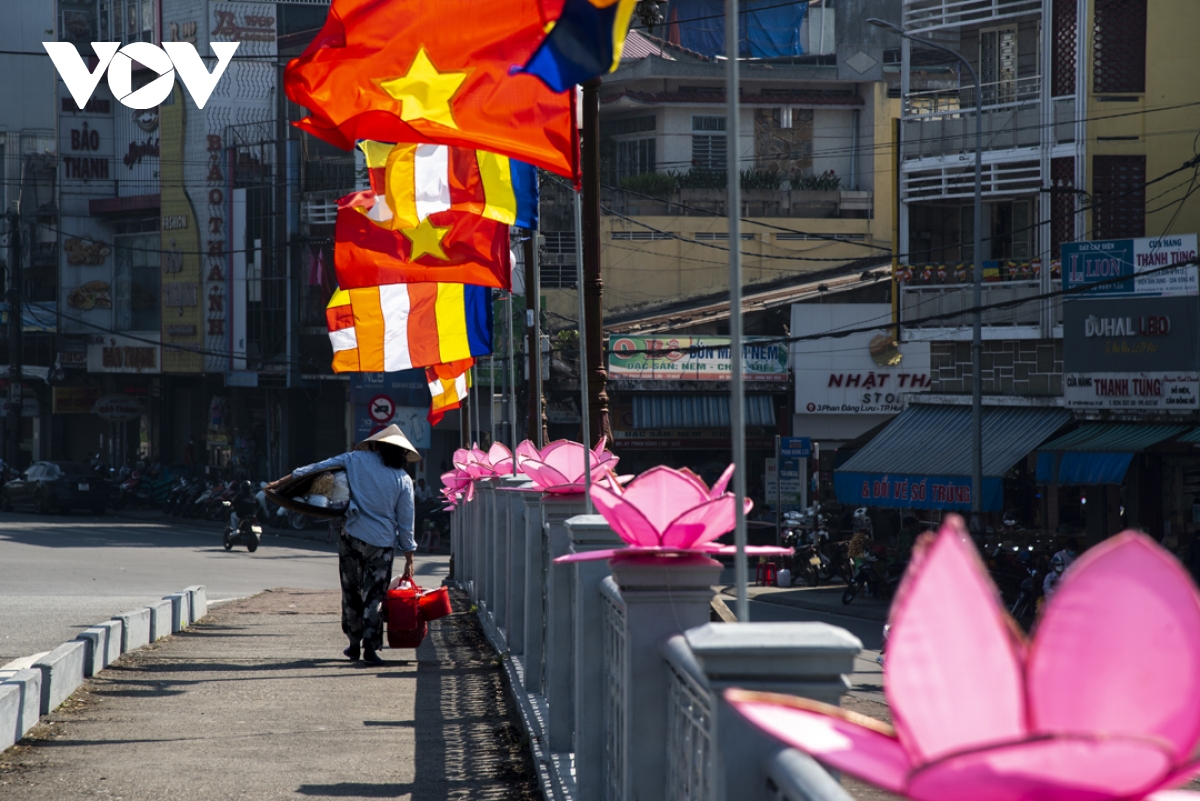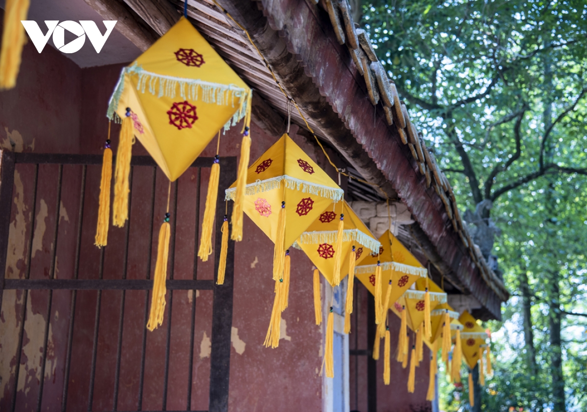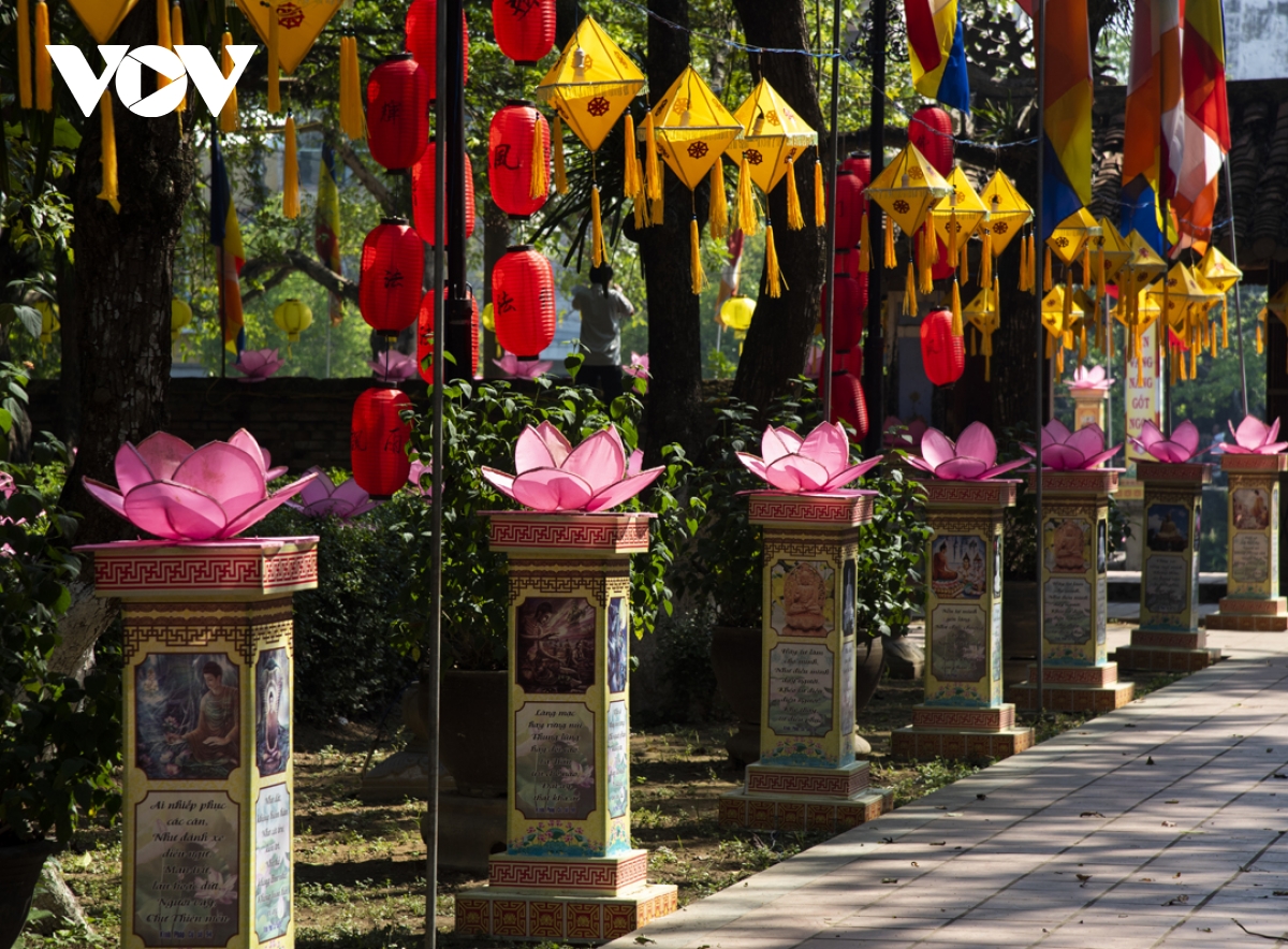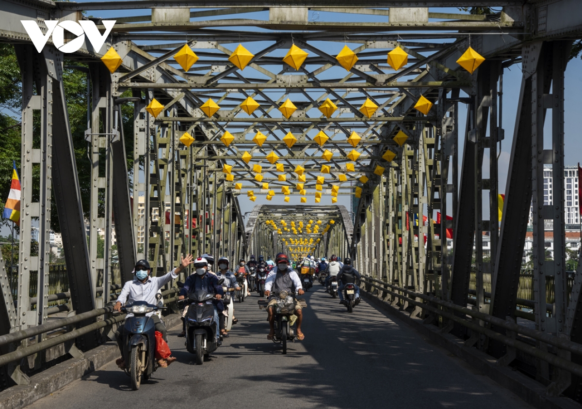 Trong thời gian diễn ra lễ hội, trên các tuyến đường từ thành thị đến nông thôn đều được trang hoàng cờ đèn, tạo không khí hân hoan của người dân xứ Huế đón chào mùa Phật đản. |