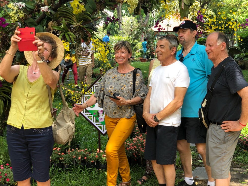| Nhóm du khách đến từ Pháp rất phấn khích vì đến thành phố Hồ Chí Minh đúng dịp Lễ hội hoa lan. |