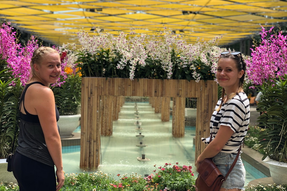 | Hai du khách Úc tạo dáng bên tiểu cảnh lan tại lễ hội. Hai cô cho biết thực sự bị hấp dẫn bởi những giống lan mới, quý hiếm tại lễ hội này. |