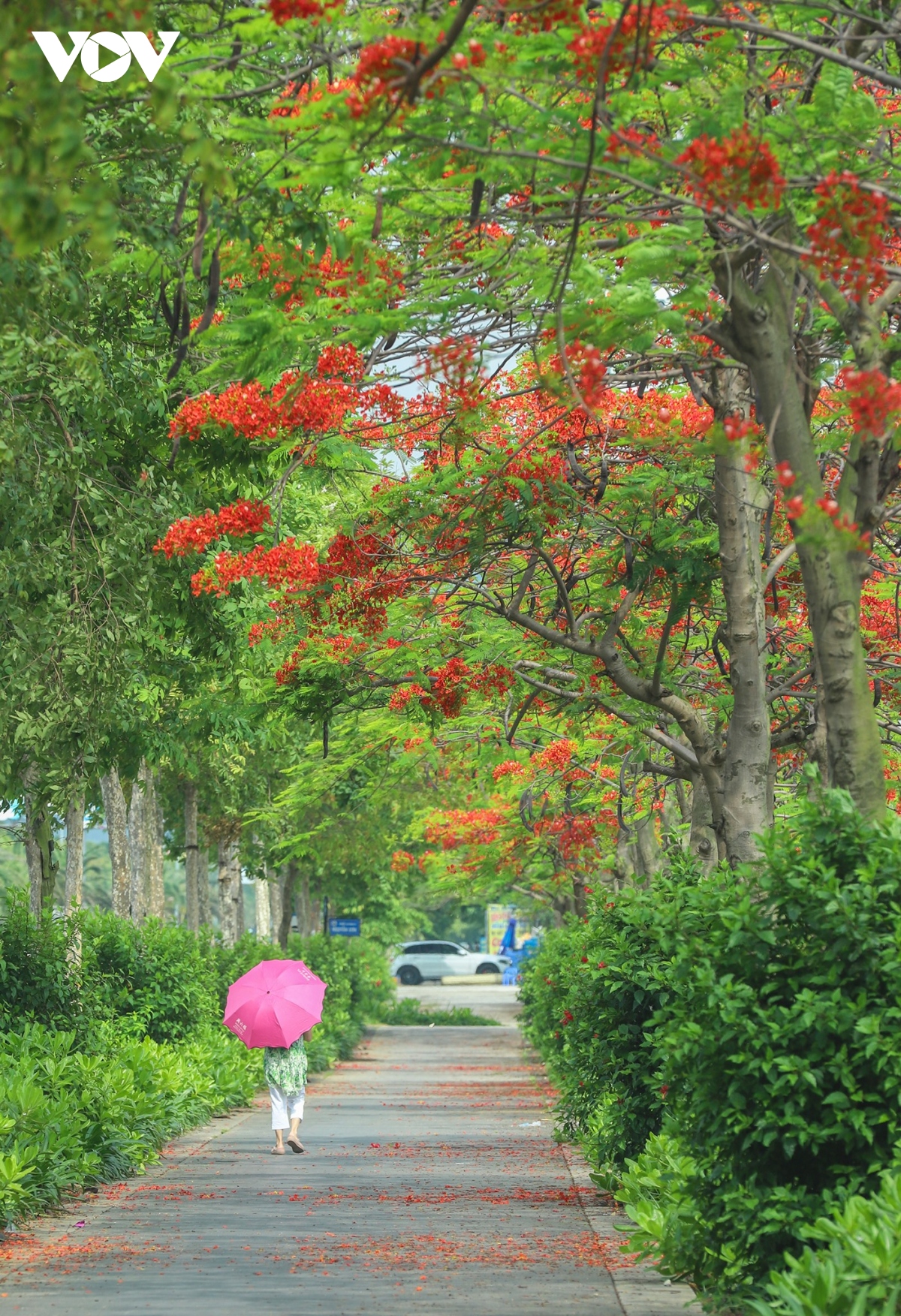 Hàng phượng trải dài ở đô thị Hùng Thắng rắc thảm hoa đỏ sau cơn mưa hè, khung cảnh vừa lãng mạn vừa bình yên.