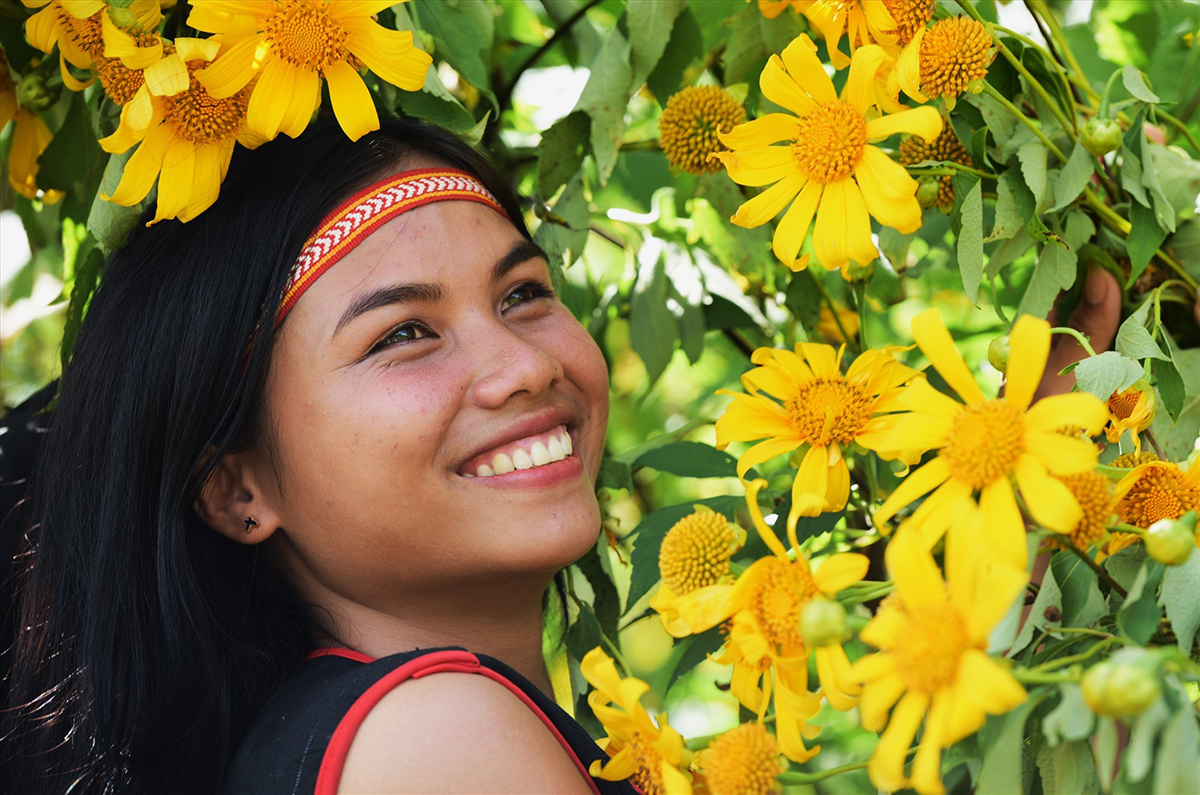 Thiếu nữ Jrai bên hoa dã quỳ. Ảnh: baoquangnam.vn |