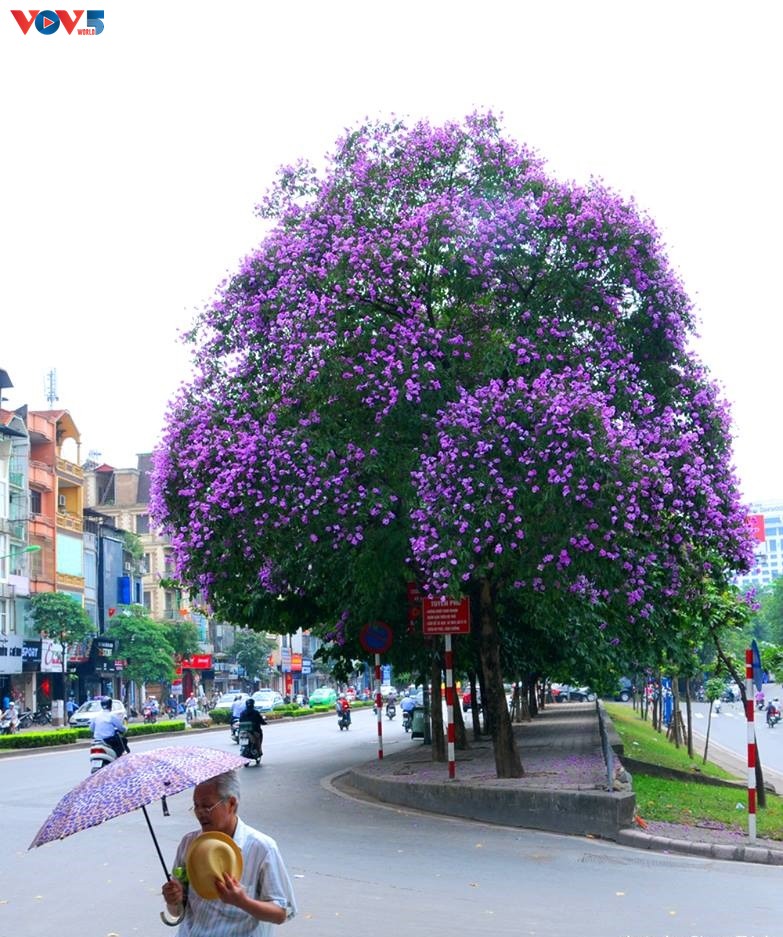 Hòa quện cùng với sắc đỏ của hoa phượng, bạn sẽ dễ dàng bắt gặp sắc tím bằng lăng nhuộm màu thương nhớ trên mọi nẻo đường Hà Nội.