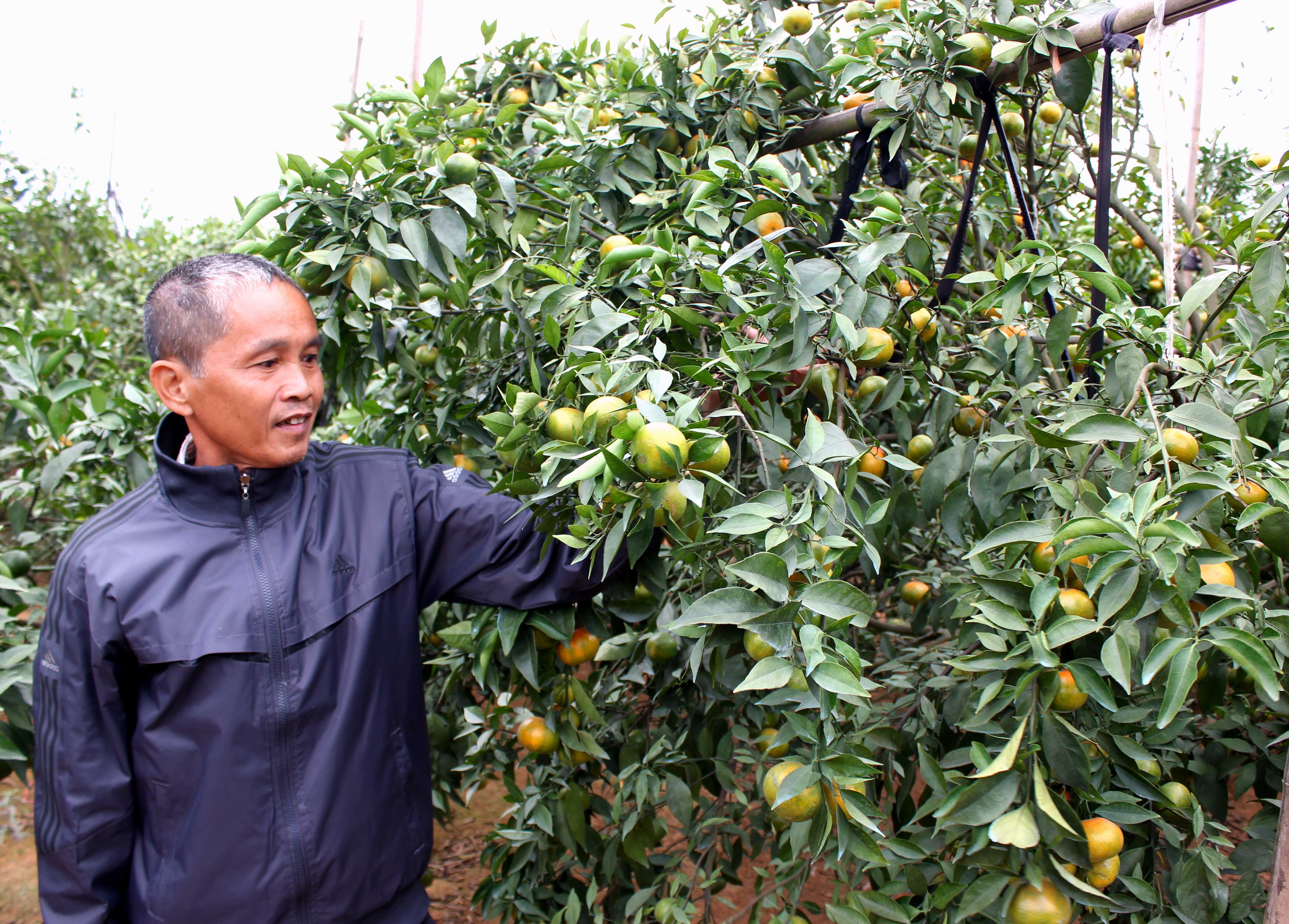 | Ông Vũ Văm Cam ở thôn Trường Sinh đang giới thiệu về cây cam Canh trĩu quả chuẩn bị cho thu hoạch |