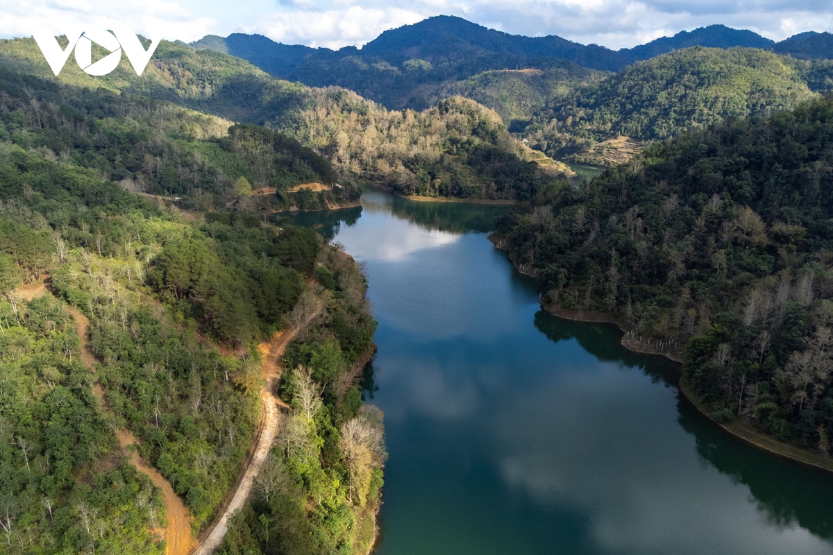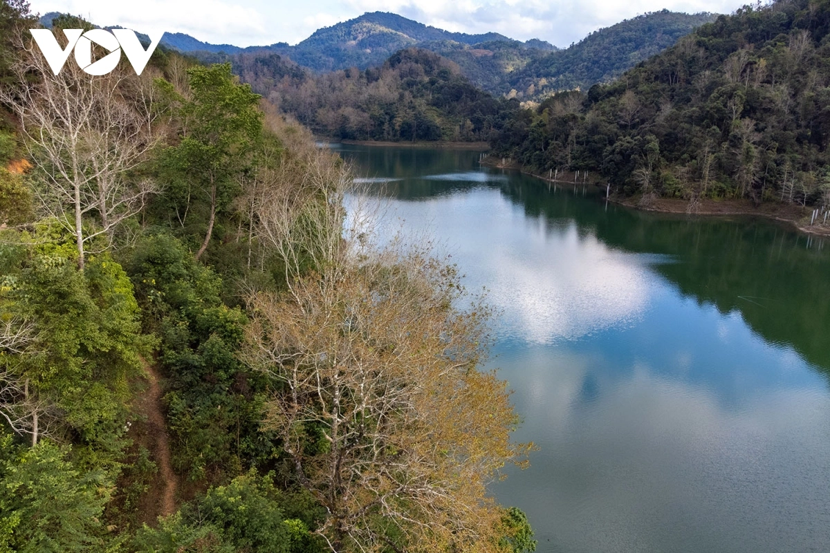 Khi tiết trời sang xuân, hồ Bản Viết như khoắc lên mình tấm áo mới khi những lá non đâm chồi nảy lộc. Xa xa những hàng cây sau đã rụng lá như tô điểm thêm cho bức tranh thiên nhiên thơ mộng, yên bình.