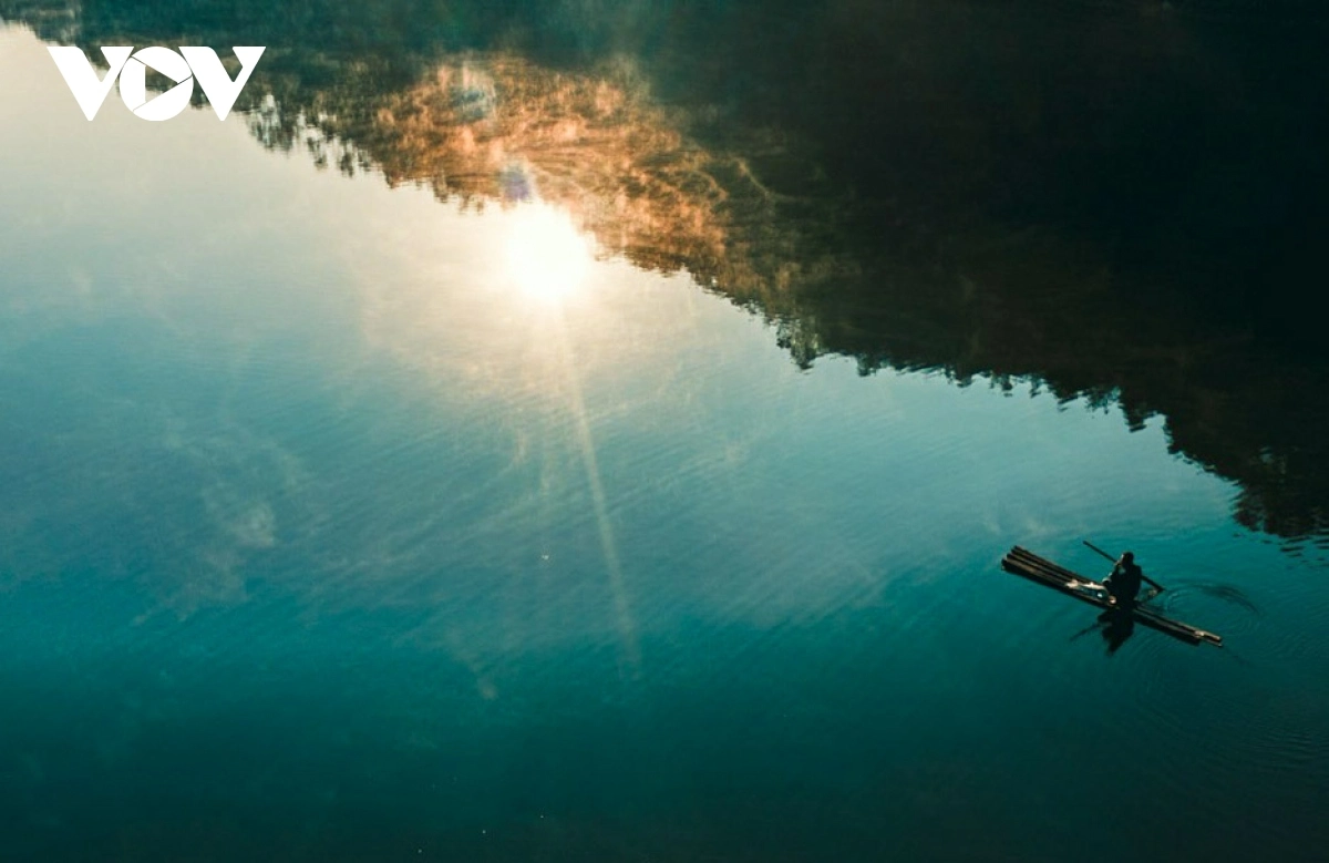 Những khi chiều tà, ánh hoàng hôn buông xuống, mặt hồ xanh biếc không gợn sóng. Nhiều du khách tới đây chọn thời điểm này để chèo bè mảng tham quan quang cảnh bên hồ, hòa mình với dòng nước trong xanh, cảm nhận sự thư thái và bình yên.