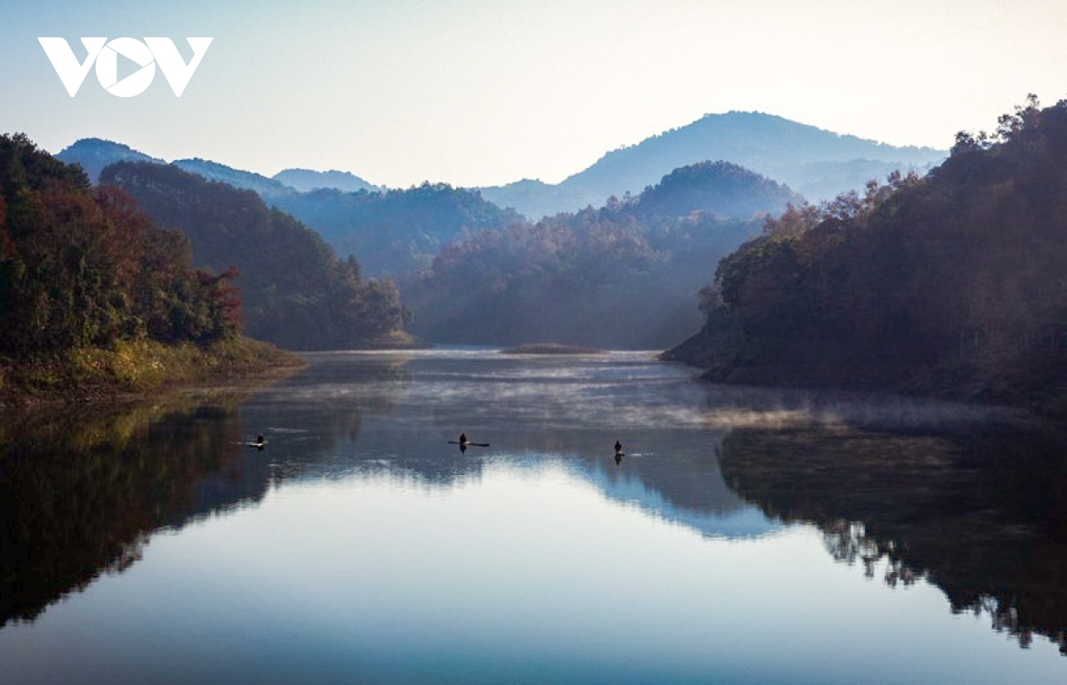 Hồ nước hiện lên như tấm gương khổng lồ, xung quanh là những cánh rừng xanh thẳm vừa thay áo mới ôm lấy mặt hồ.