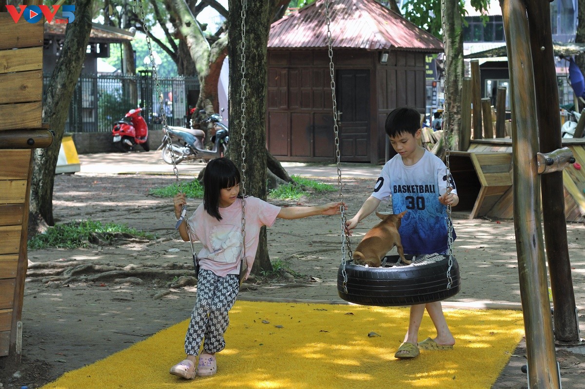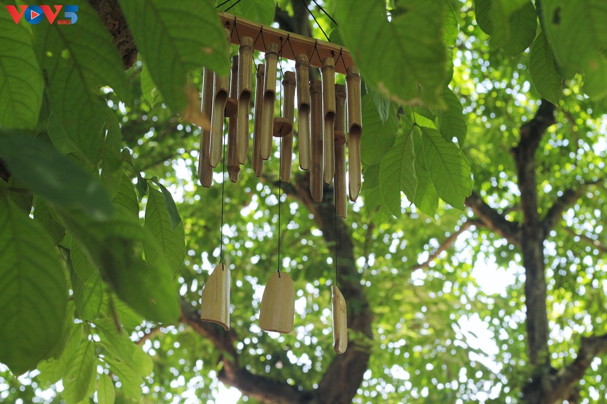 Một vài chiếc chuông gió được điểm xuyết dưới tán cây xanh trong không gian sân chơi. |