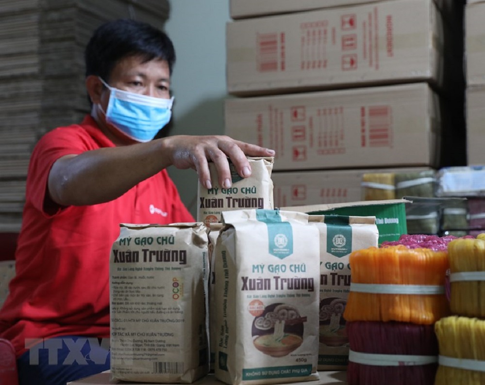 Mẫu mã bao bì thân thiện với môi trường được ứng dụng trong dây chuyền đóng gói sản phẩm Mỳ Chũ tại Hợp tác xã sản xuất Mỳ Chũ Xuân Trường, xã Nam Dương, huyện Lục Ngạn, tỉnh Bắc Giang. Ảnh: TTXVN