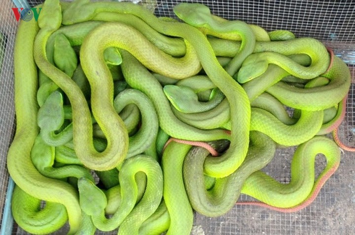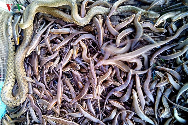 | Rắn lục đuôi đỏ, một loại rắn độc và sinh sản mạnh vào mùa này, được người dân khai thác làm món ăn. |