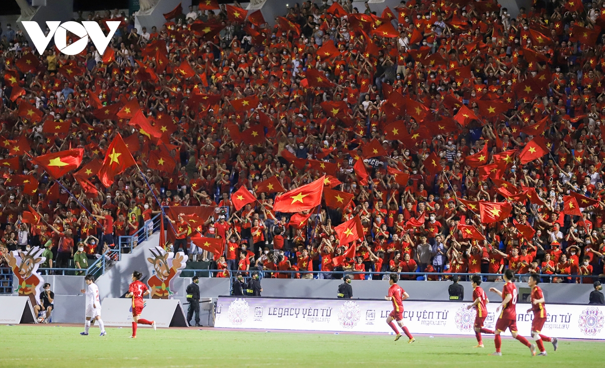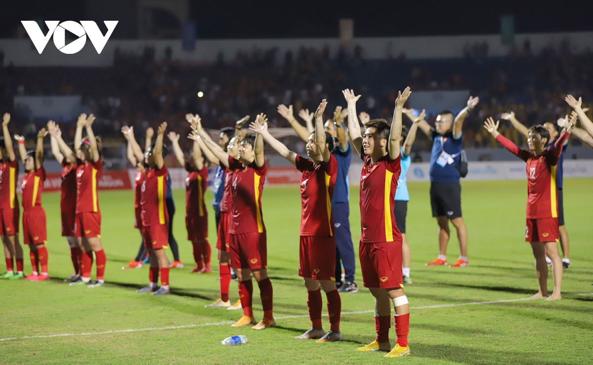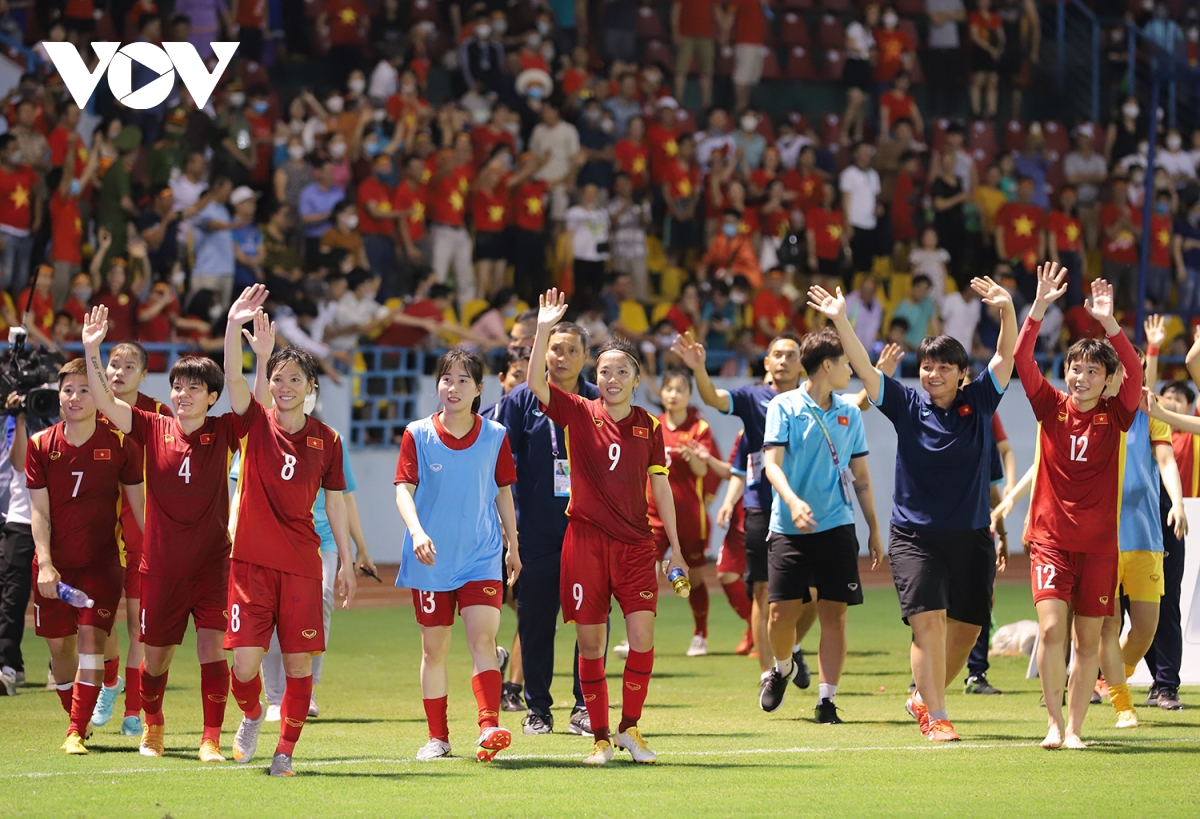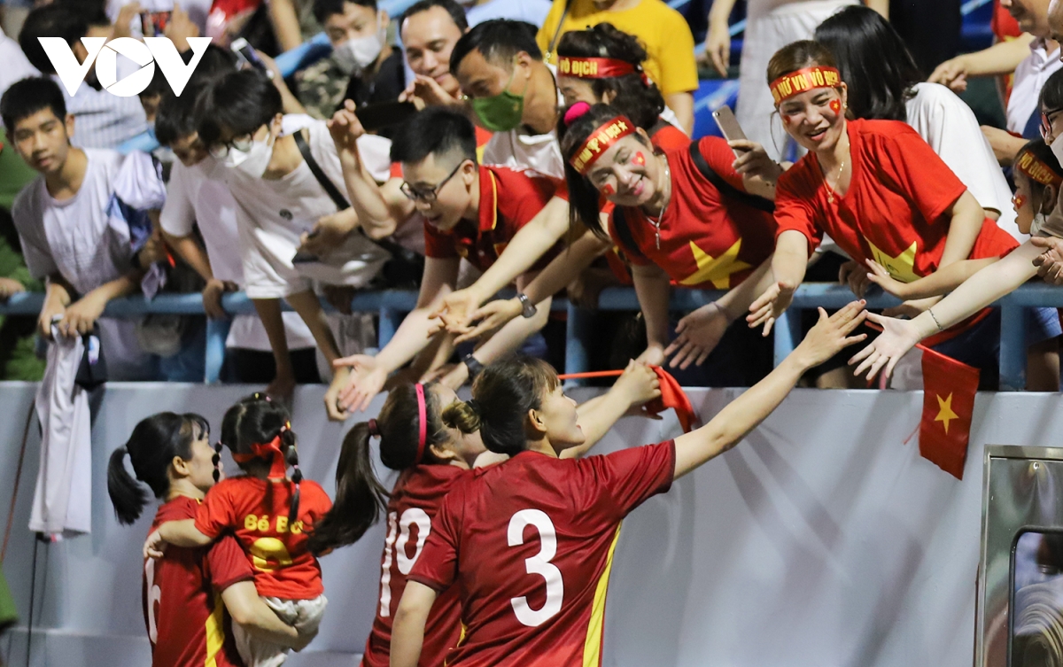 Các cô gái cùng BHL đi dọc các khán đài, cúi người tri ân tình cảm nhiệt thành của cổ động viên, vỗ tay viking ăn mừng. Họp báo sau trận đấu, HLV Mai Đức Chung gửi lời cảm ơn tới khán giả, những người đã tiếp thêm sức mạnh cho đội tuyển. |
