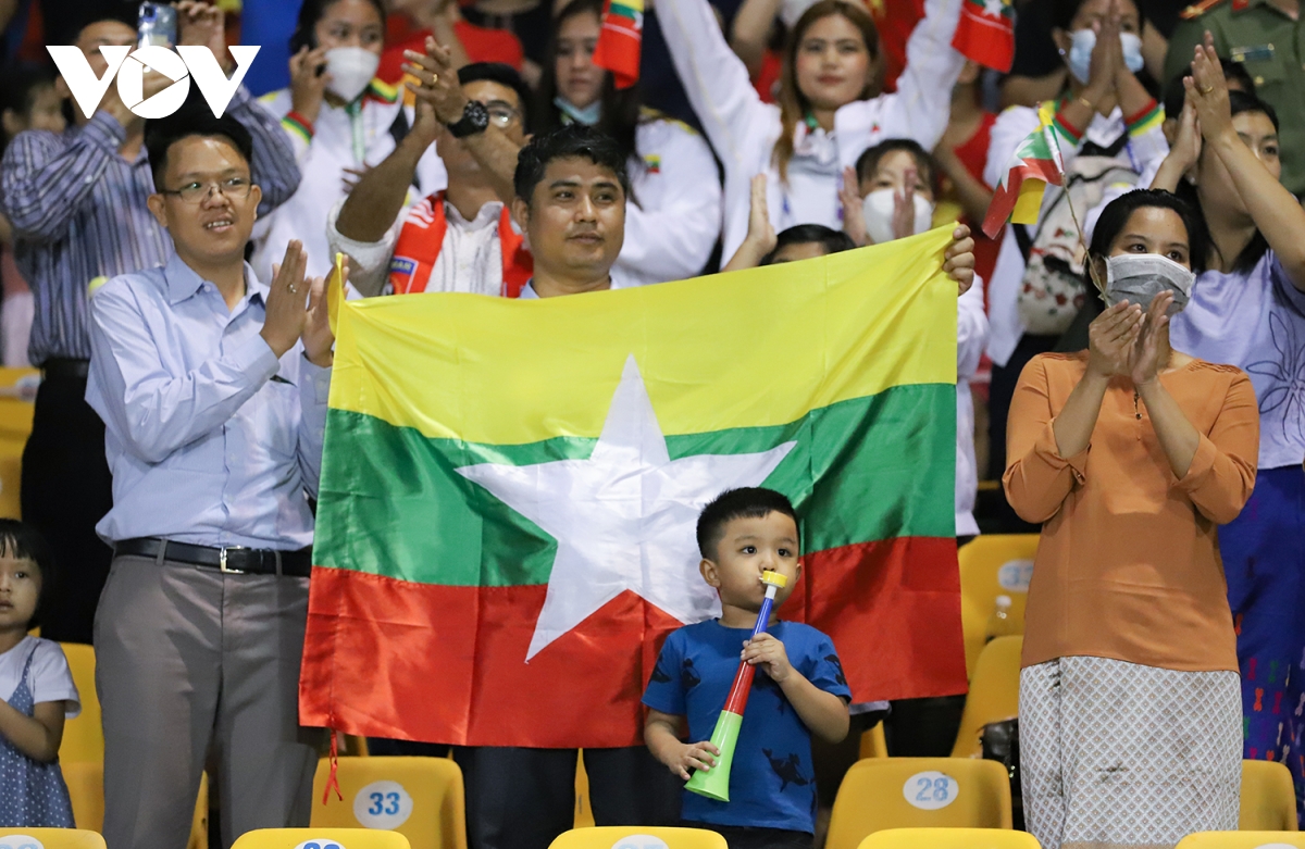 Cổ động viên Myanmar tại khán đài D, tiếp sức cho các cô gái đội tuyển của mình. |