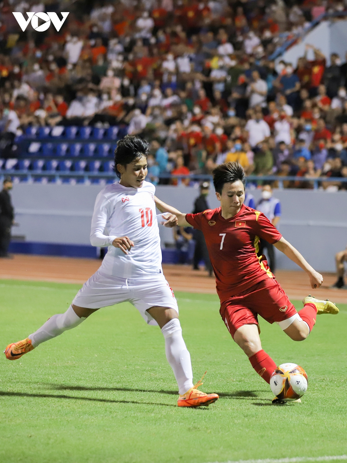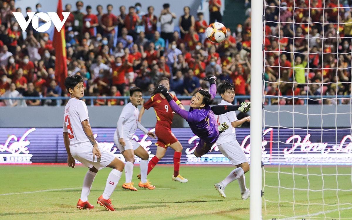 Hàng phòng ngự Việt Nam thi đấu quả cảm, cứu thua xuất sắc trong khi hàng công pressing tầm cao, phối hợp liên tiếp tạo tình huống nguy hiểm khiến thủ môn Myanmar vất vả cản phá. |
