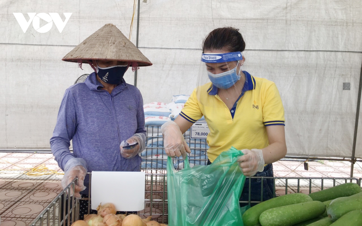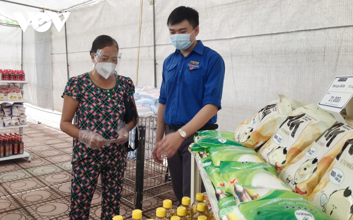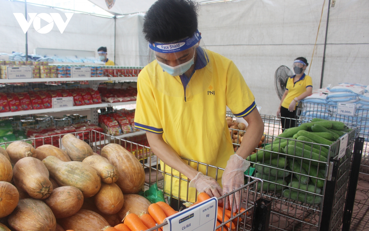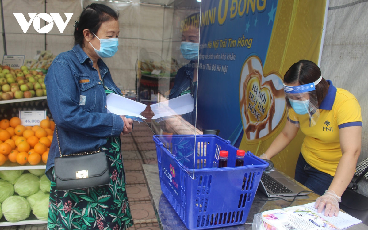 Bà Phạm Thúy Dung, Giám đốc PNJ Miền Bắc cho biết: “Mặc dù trong thời điểm này việc tổ chức và vận hành siêu thị là một thách thức và gặp nhiều khó khăn, nhưng với bề dày của ngành bán lẻ trang sức, đá quý, đội ngũ chúng tôi chuyển hết kinh nghiệm sang mô hình siêu thị này. Chỉ với 5 ngày, chúng tôi đã setup xong mô hình siêu thị mini này một cách bài bản từ hàng hóa, quy trình mua hàng cũng như đảm bảo các yếu tố phòng dịch cho cả người bán và người tới mua hàng”. (Ảnh: Nhân viên siêu thị hỗ trợ người dân mua hàng) |