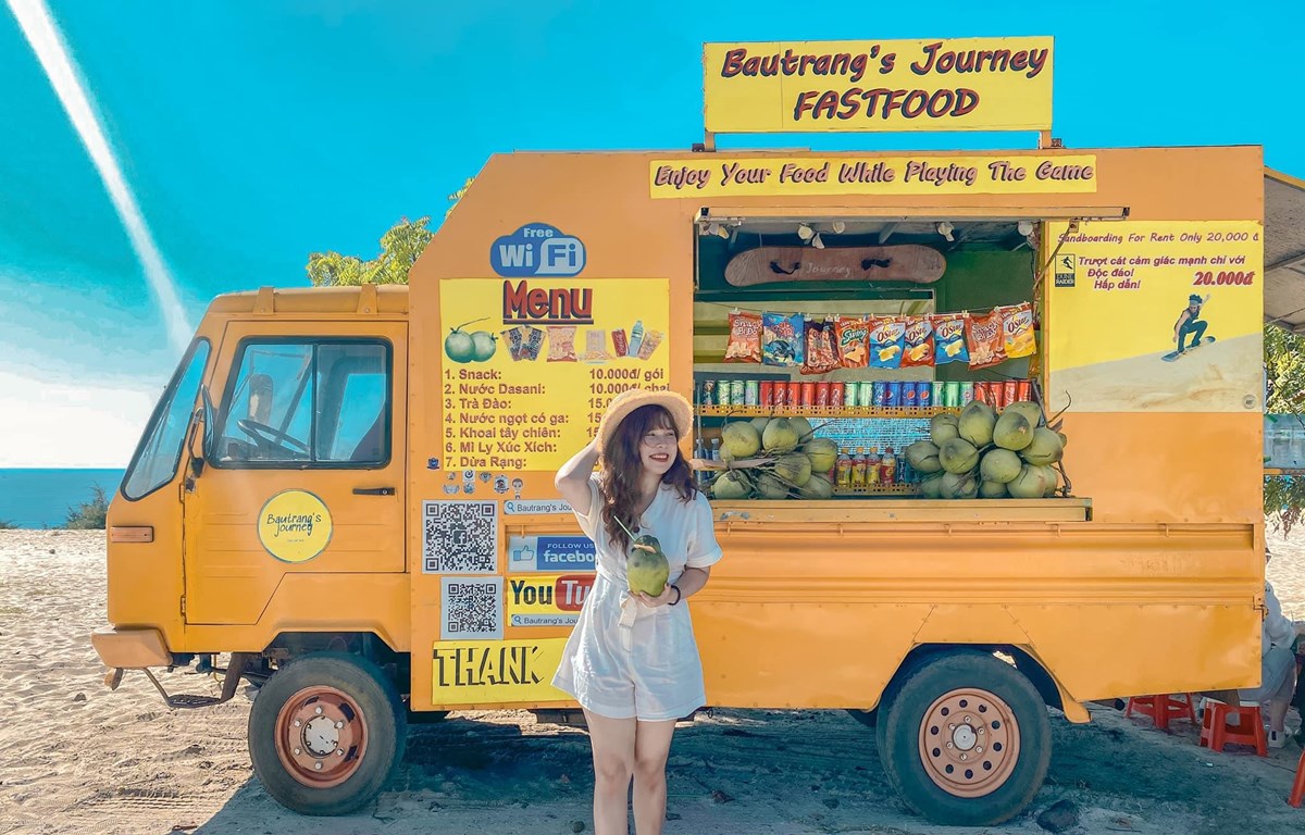 Du khách thích thú chụp hình lưu niệm với quầy bán hàng di động ở Mũi Né, Bình Thuận. Ảnh: CTV/Vietnam+