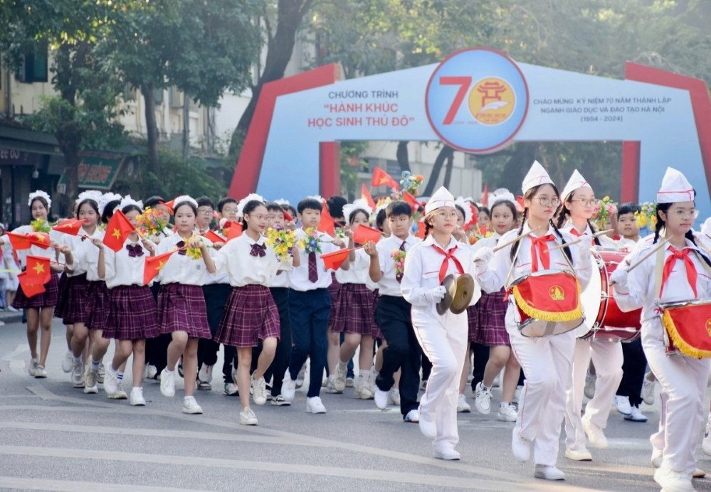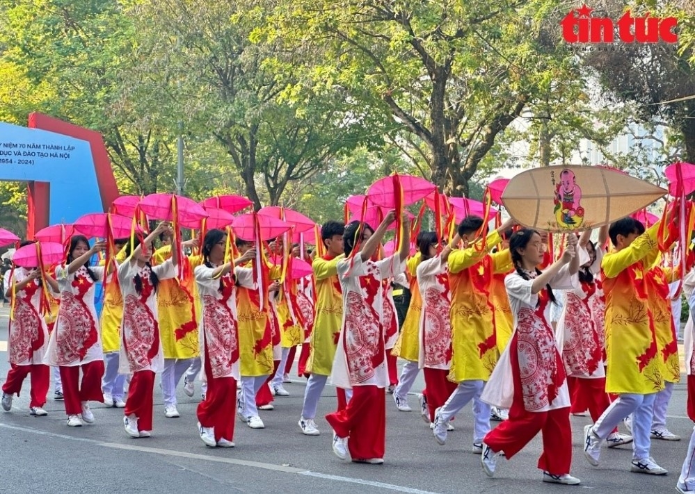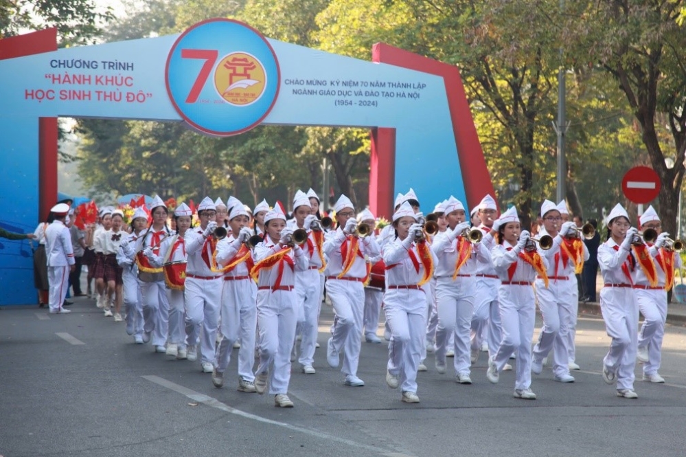 Sáng 10/11, tại không gian Phố đi bộ Hồ Gươm, Sở Giáo dục và Đào tạo (GD-ĐT) Hà Nội tổ chức chương trình “Hành khúc học sinh Thủ đô”, mở đầu cho chuỗi hoạt động ý nghĩa nhân kỷ niệm 70 năm thành lập ngành Giáo dục và Đào tạo Hà Nội. Ảnh: Hồng Phượng/Báo Tin tức |