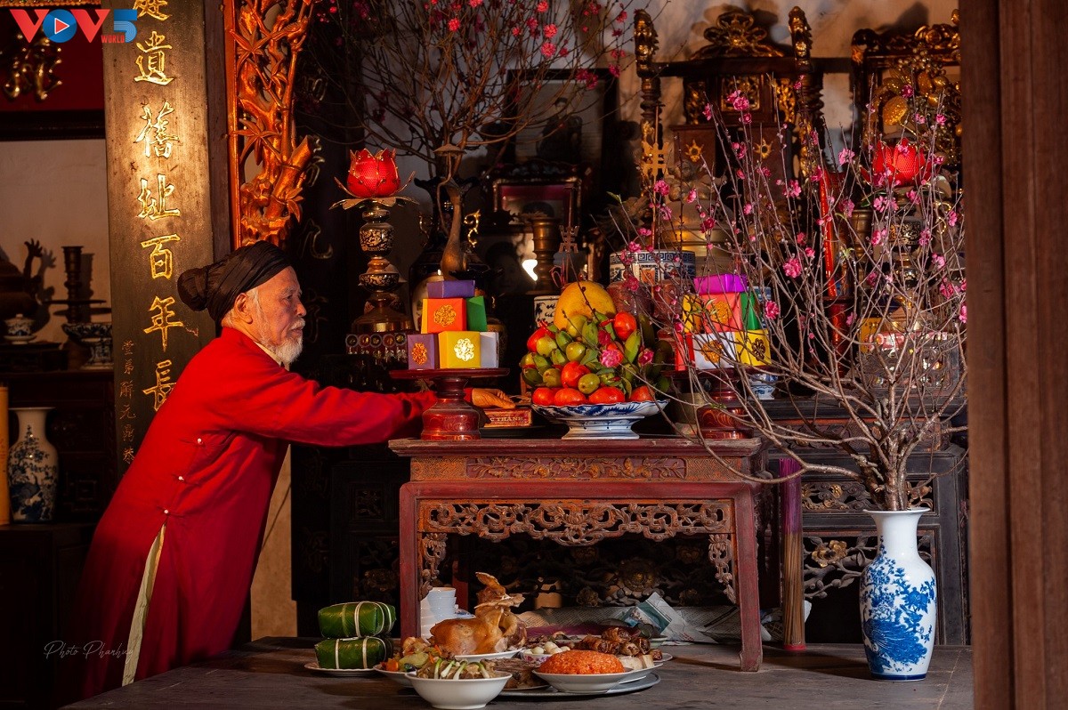 Mâm ngũ quả và mâm cơm ngày Tết được chuẩn bị thịnh soạn dâng lên ban thờ tổ tiên. |