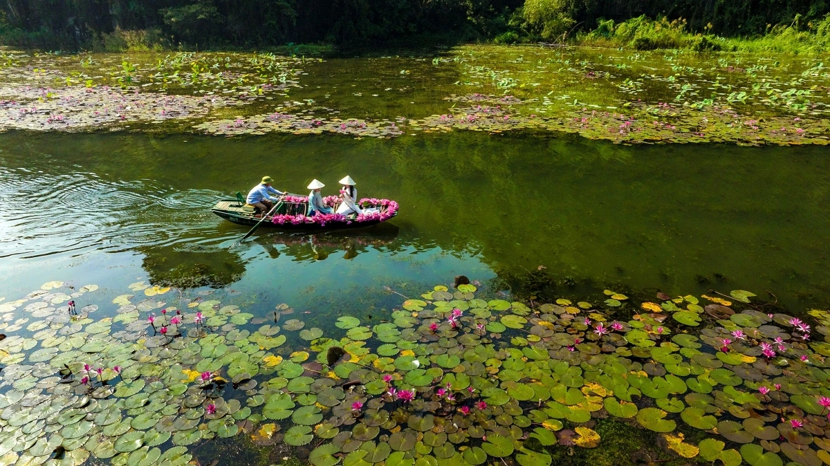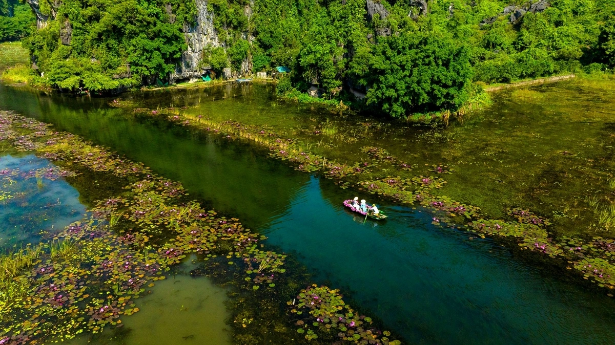 | Sông nước Tam Cốc nay điểm tô thêm màu hoa súng, tạo nên khung cảnh đẹp như tranh vẽ. |