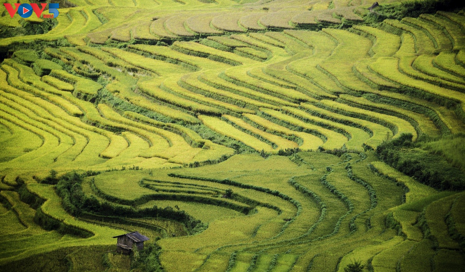 Nhà em lưng chừng đồi, bao quanh là sóng lúa vàng tươi.