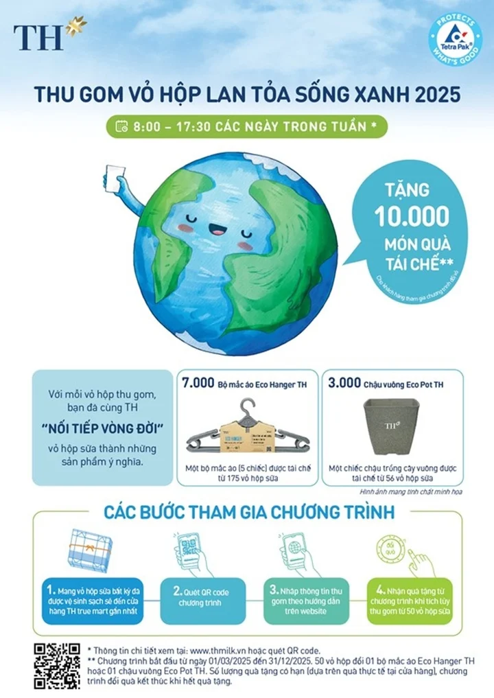 Tiếp nối thành công của dự án "Thu gom vỏ hộp, Lan tỏa sống xanh 2024", Tập đoàn TH hợp cùng Tetra Pak Việt Nam triển khai chương trình "Thu gom vỏ hộp, Lan tỏa sống xanh 2025" tại hệ thống cửa hàng TH true mart. Đây là hoạt động mang tính bền vững, thể hiện cam kết của TH trong việc bảo vệ môi trường và lan tỏa ý thức tiêu dùng có trách nhiệm trong cộng đồng.