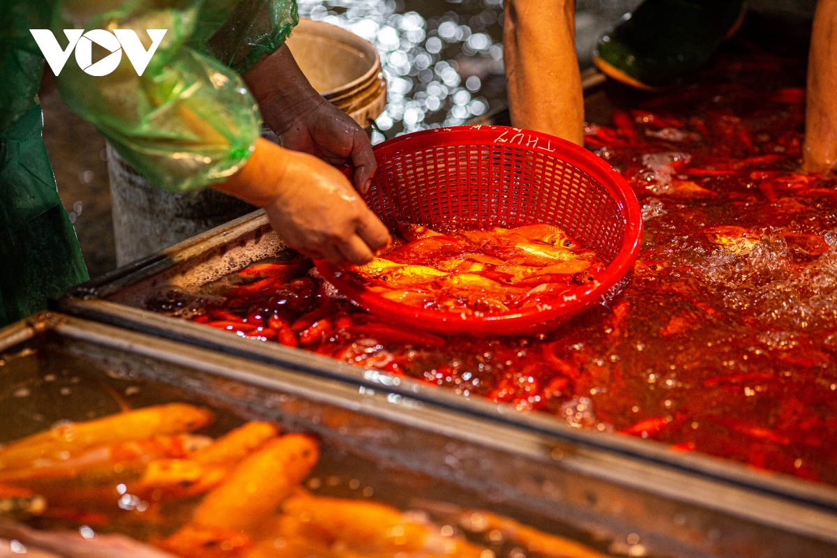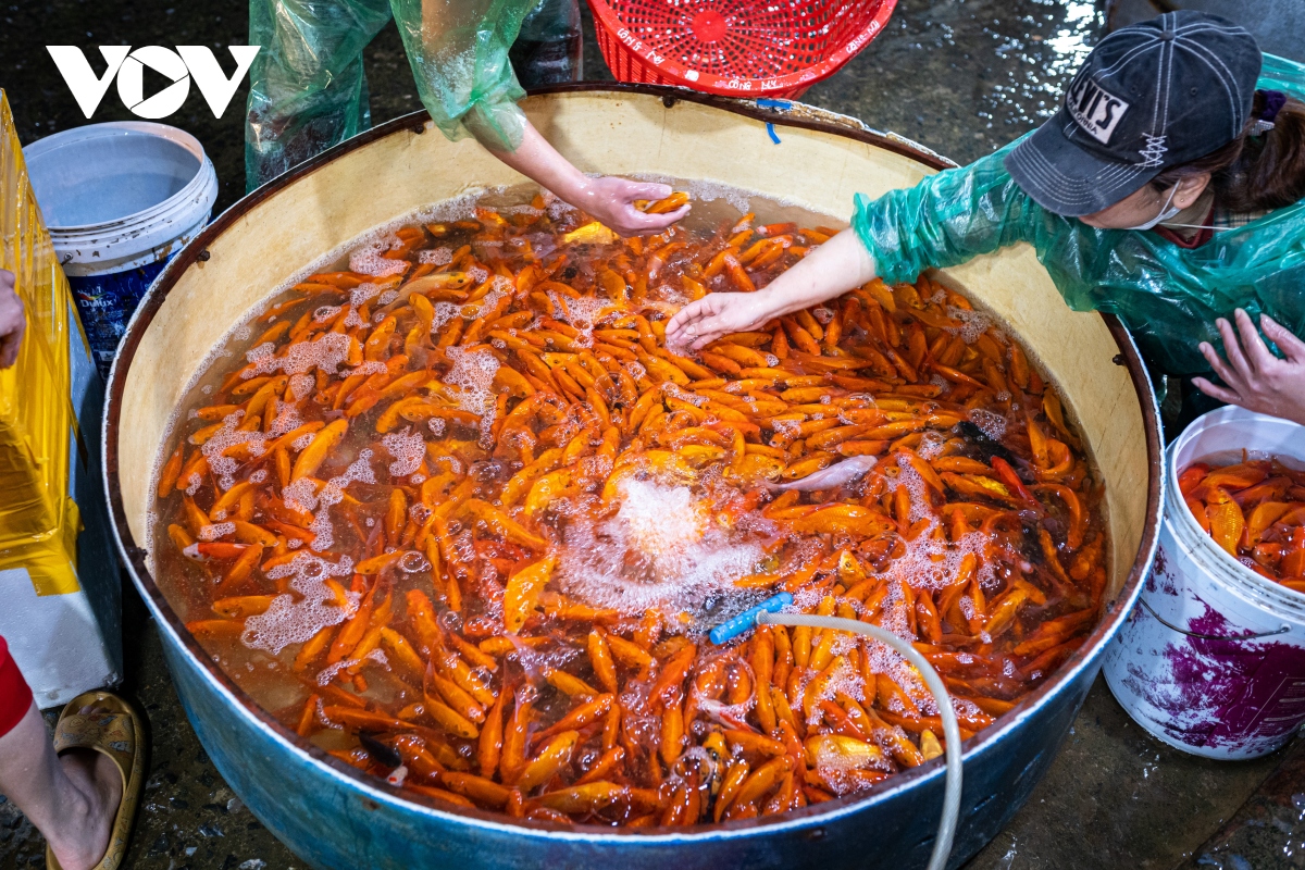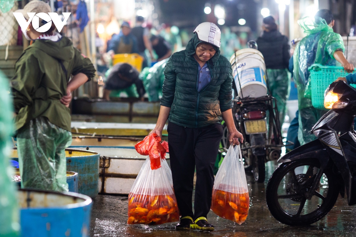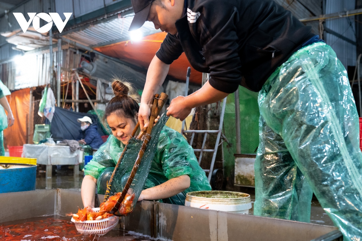 Rạng sáng 13/1 (22 tháng Chạp âm lịch), tiểu thương và người tìm mua buôn cá chép cúng ông Công, ông Táo nhộn nhịp khắp chợ đầu mối Yên Sở. |