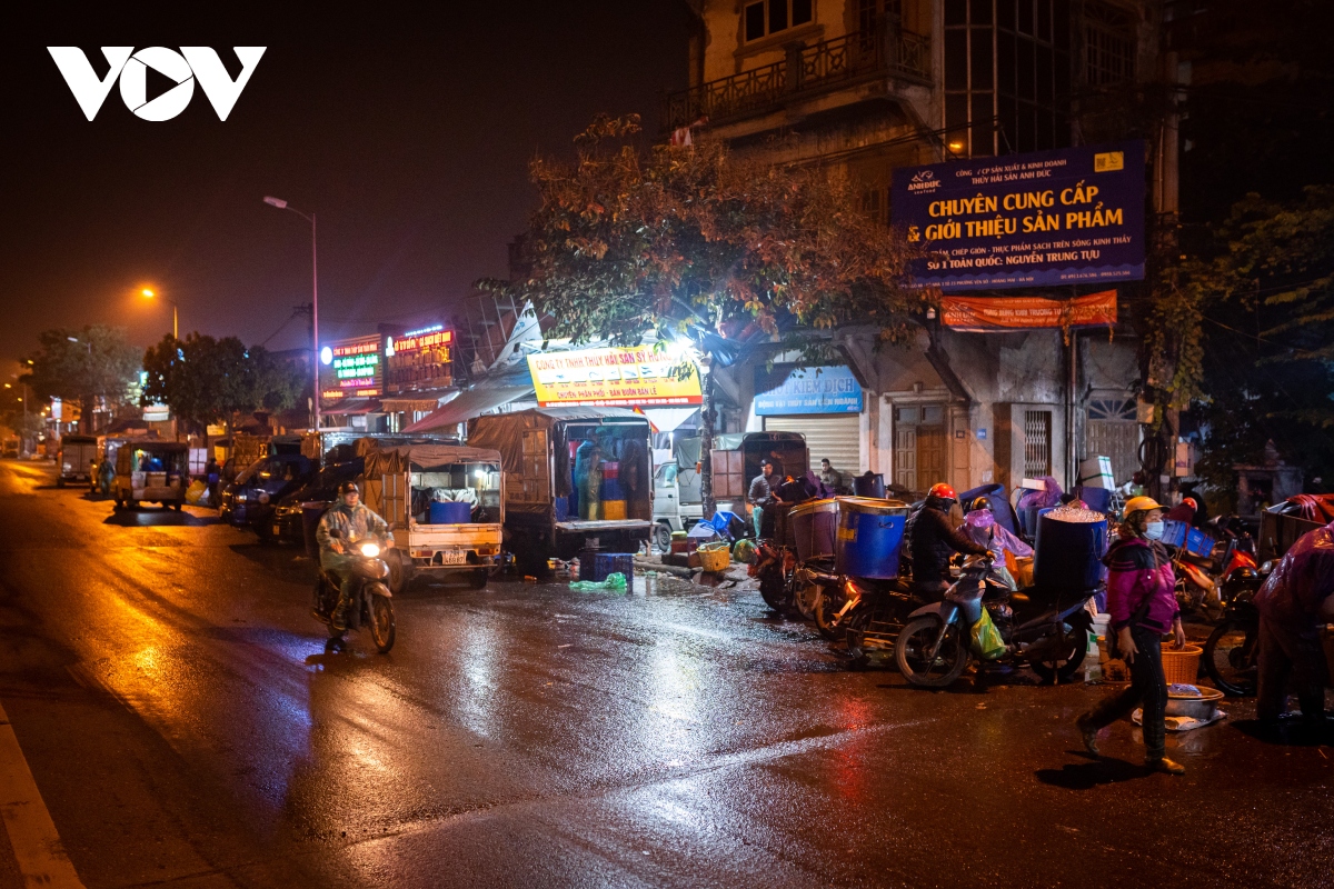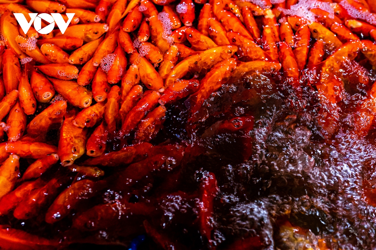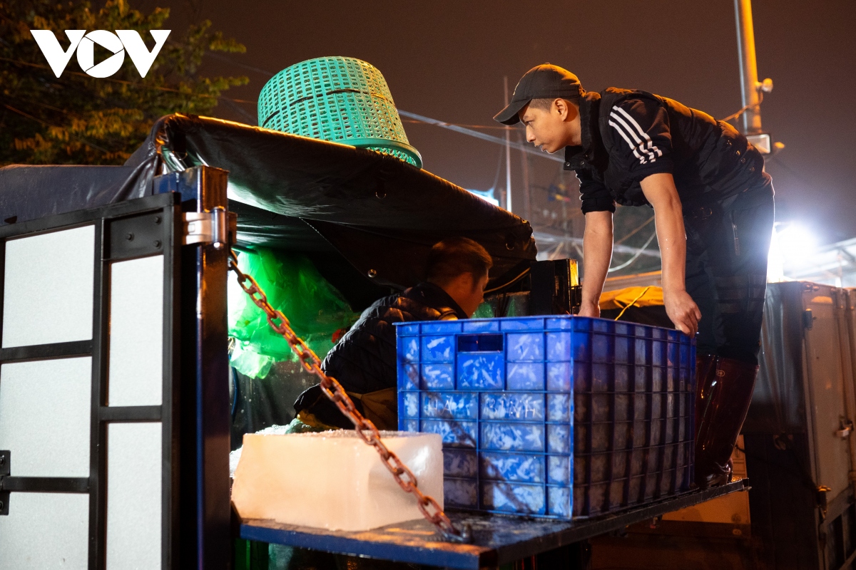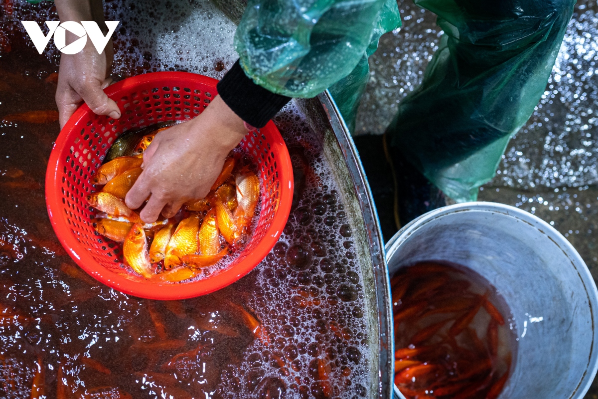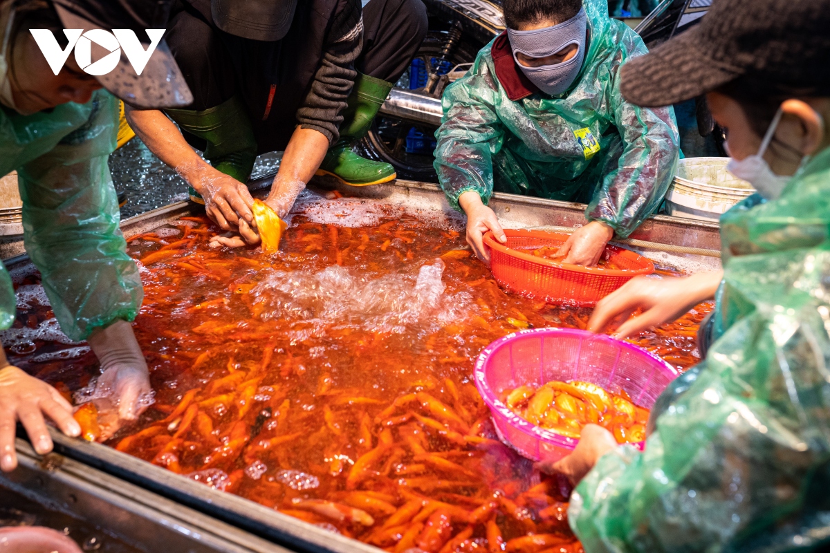 Rạng sáng 13/1 (22 tháng Chạp âm lịch), tiểu thương và người tìm mua buôn cá chép cúng ông Công, ông Táo nhộn nhịp khắp chợ đầu mối Yên Sở. |