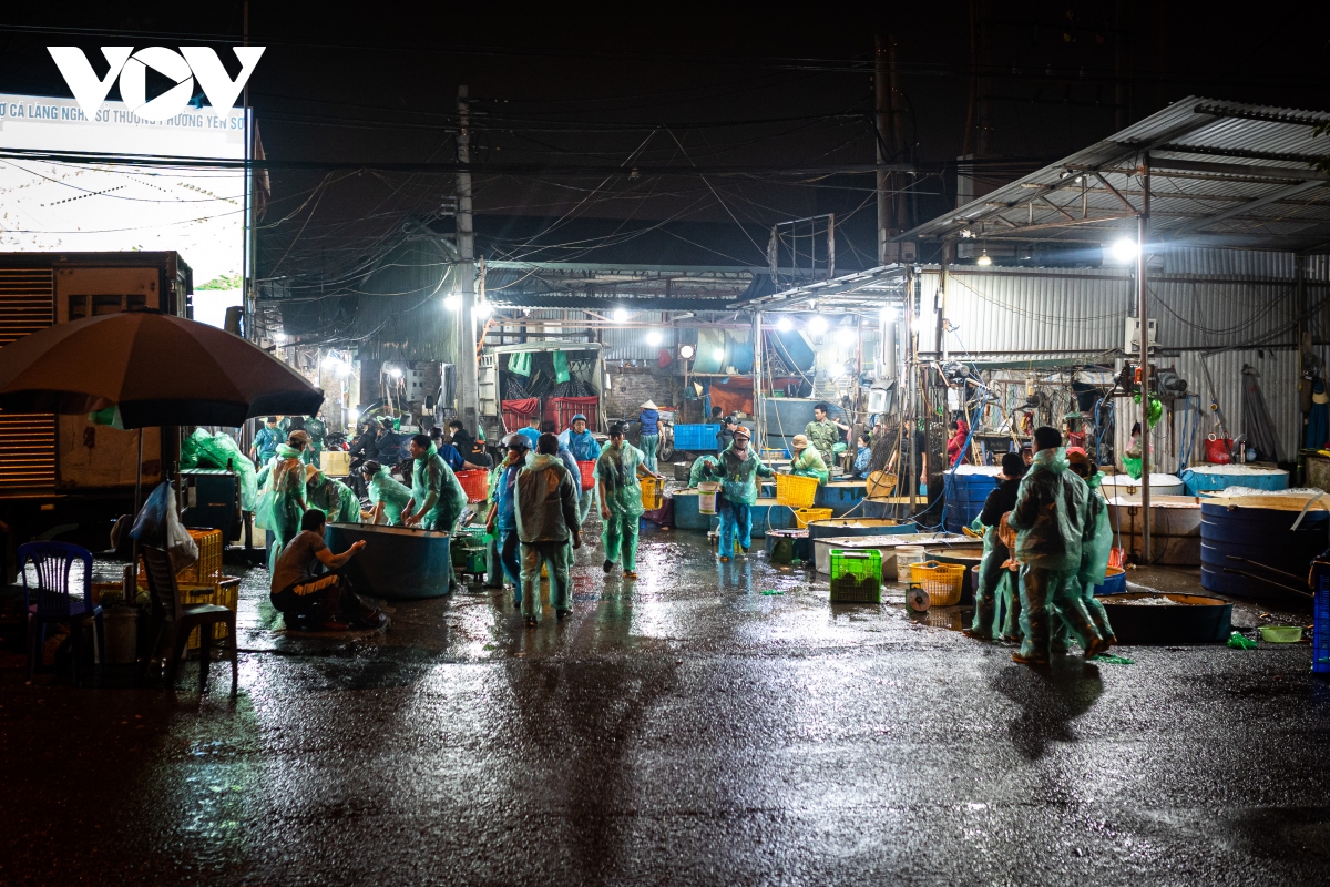 Xe tải từ các tỉnh Phú Thọ, Nam Định và Hải Dương chở cá đưa về chợ Yên Sở. |