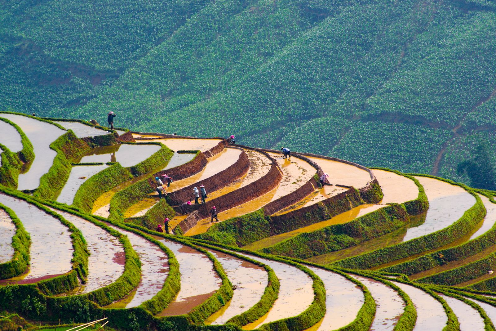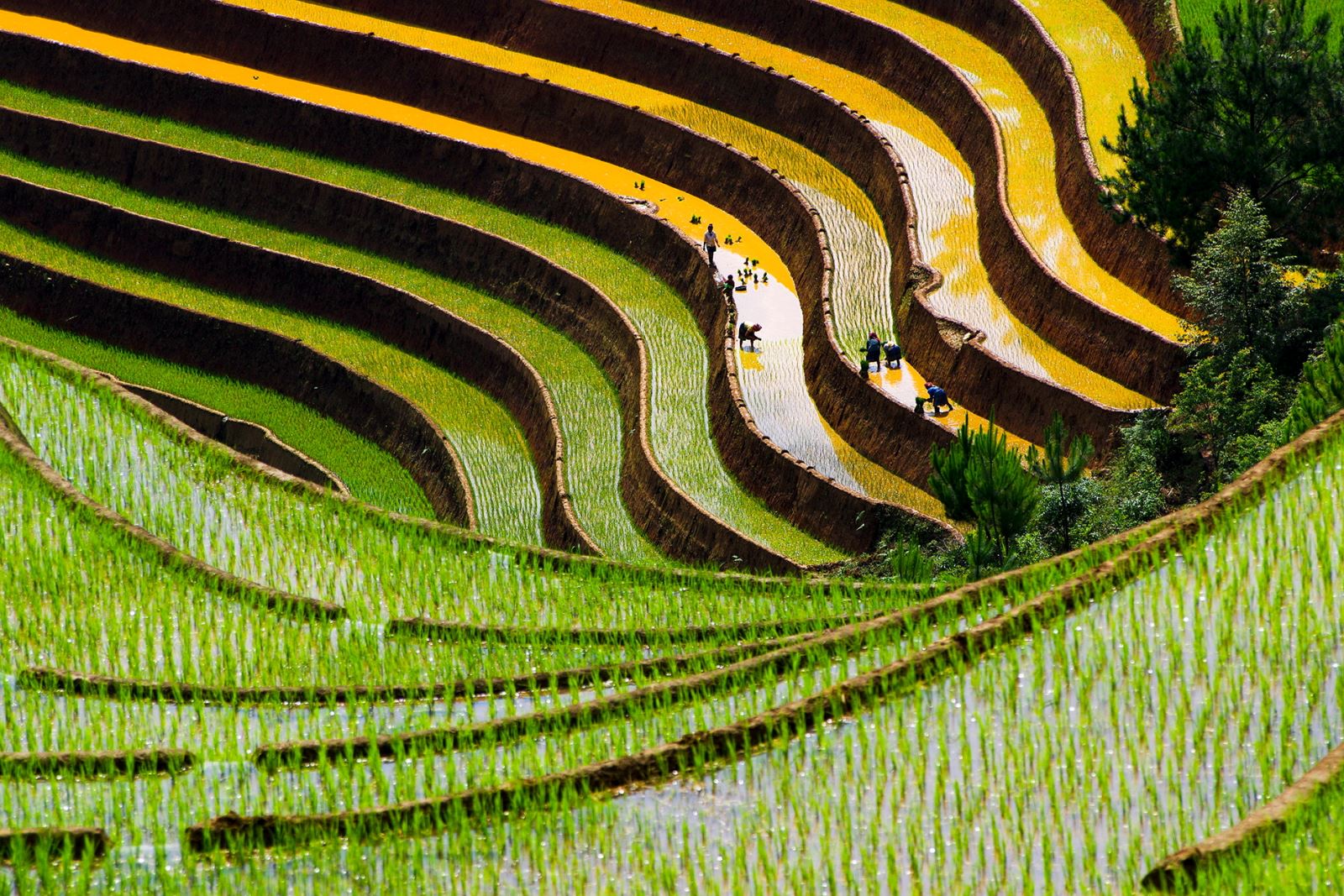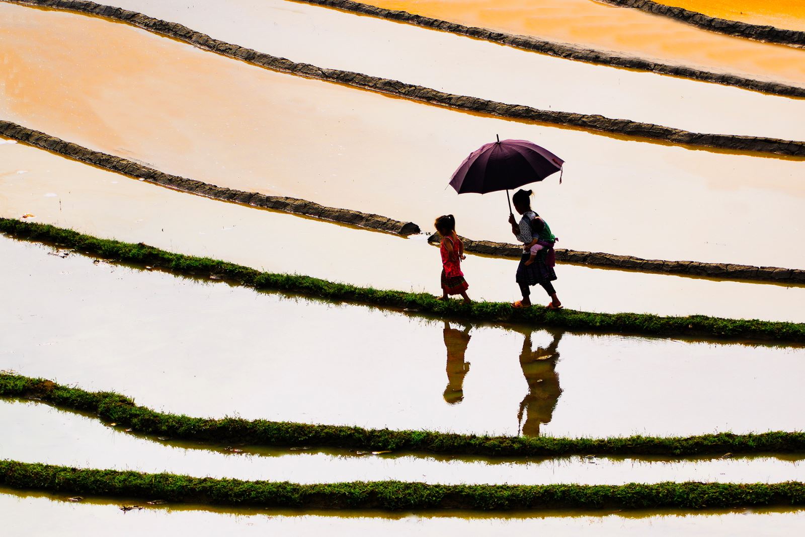 Xuân đi, hạ về. Những đám mây mang những cơn mưa nặng hạt đến. Và thành nước ruộng xám trắng, rồi vàng đất sét, đổ từ bậc thang ruộng này sang bậc thang ruộng khác, mênh mang pha màu trong đất ải trộn với màu của trời xanh trên cao, phản chiếu để tạo nên một bức họa thiên nhiên có sắc màu kỳ vĩ. Đẹp đến kỳ lạ.