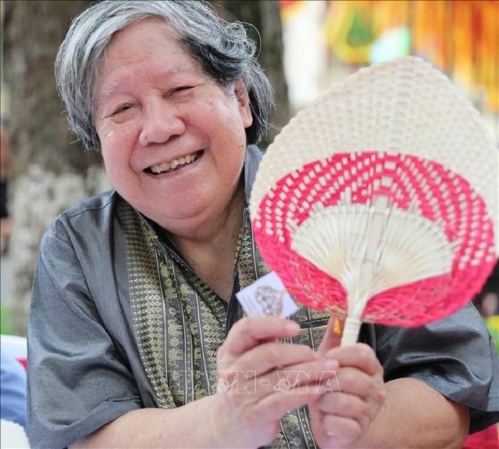 Nhà sử học Lê Văn Lan phấn khởi với chiếc quạt được ban. Ảnh: Thanh Tùng/ TTXVN |