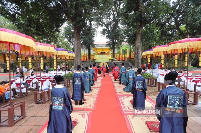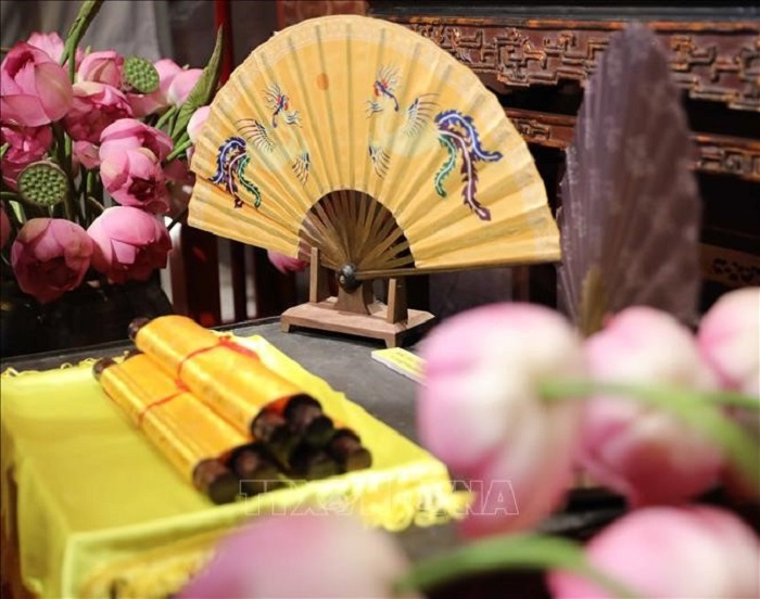 Lần đầu tiên, Trung tâm Bảo tồn Di sản Thăng Long - Hà Nội tái hiện không gian nghi lễ ban quạt trong cung đình ngày Tết Đoan Ngọ. Các thành viên Hội Di sản Văn hóa Thăng Long-Hà Nội và Công ty Cổ phần Ỷ Vân Hiên đã tham gia thực hành nghi lễ ban quạt. Những người tham gia đều vận trang phục cung đình xưa, được thực hành các nghi thức và được đón nhận quạt do vua ban. Nghi lễ diễn ra trong sự trang trọng, để lại nhiều cảm xúc và ấn tượng cho người xem. Ảnh: kinhtedothi.vn |