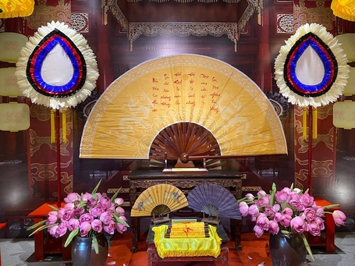 Trưng bày một số quạt dành cho vua, hoàng hậu và các quan được phỏng dựng trên các nguồn tư liệu. Ảnh: Thanh Tùng/ TTXVN |