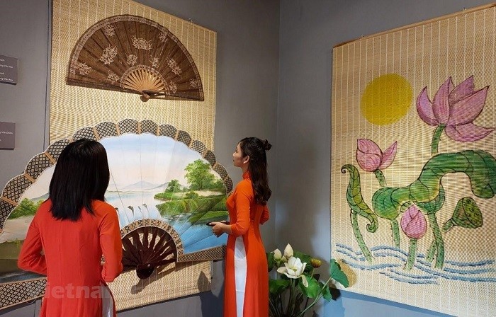 Triển lãm bộ sưu tập quạt nghệ thuật của nghệ nhân Dương Văn Đoàn (Chàng Sơn, Thạch Thất) trưng bày trong Hoàng Thành Thăng Long. Ảnh: Minh Thu/Vietnam+ |