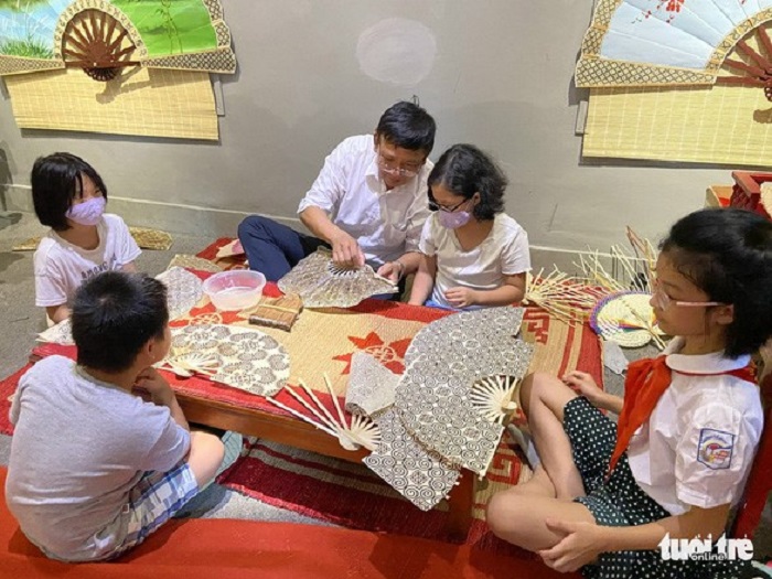 Các em nhỏ được trải nghiệm làm quạt với nghệ nhân Dương Văn Đoàn. Ảnh: Thiên Điểu/ tuoitre.vn |