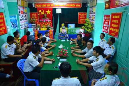 Trưởng đoàn công tác, phó tham mưu trưởng vùng 2 Hải quân, đại tá Ngô Trí Hà cùng các chiến sĩ nhà giàn họp tổng kết năm 2016 và triến khai phương hướng kế hoạch 2017