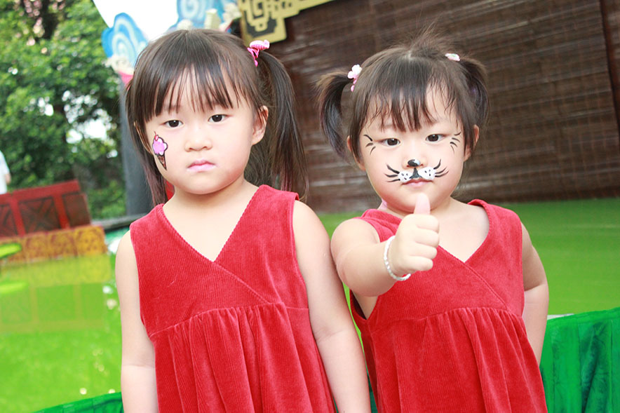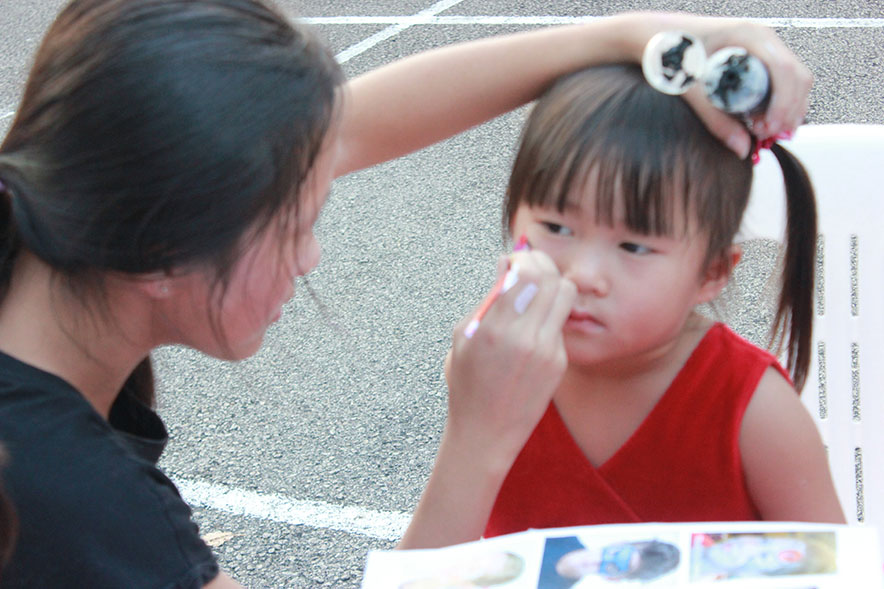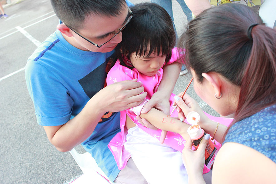Ngoài sân các anh chị tình nguyện viên vẽ hình trái tim, con thú... cho các em nhỏ