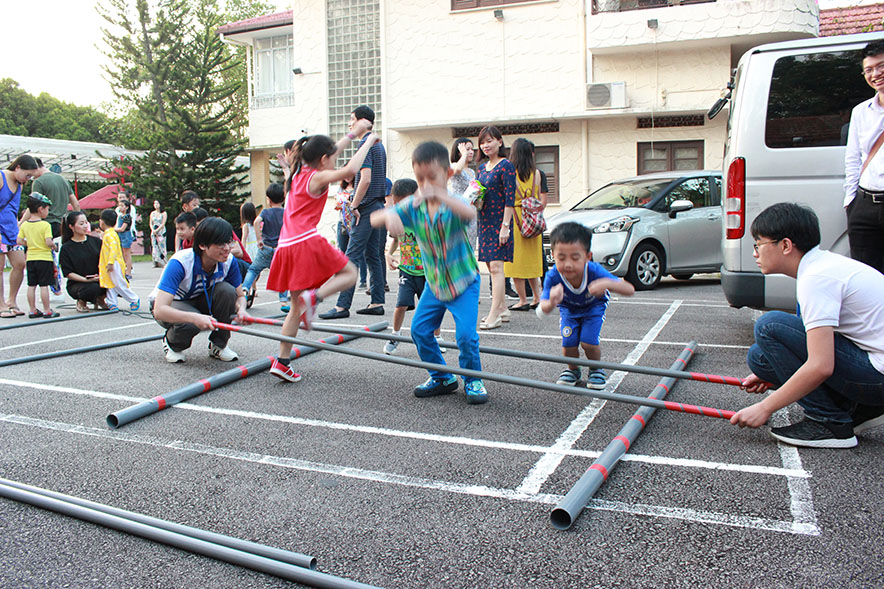 Nhảy sạp, đá cầu, ném bóng nhận quà luôn thu hút các cháu tham gia