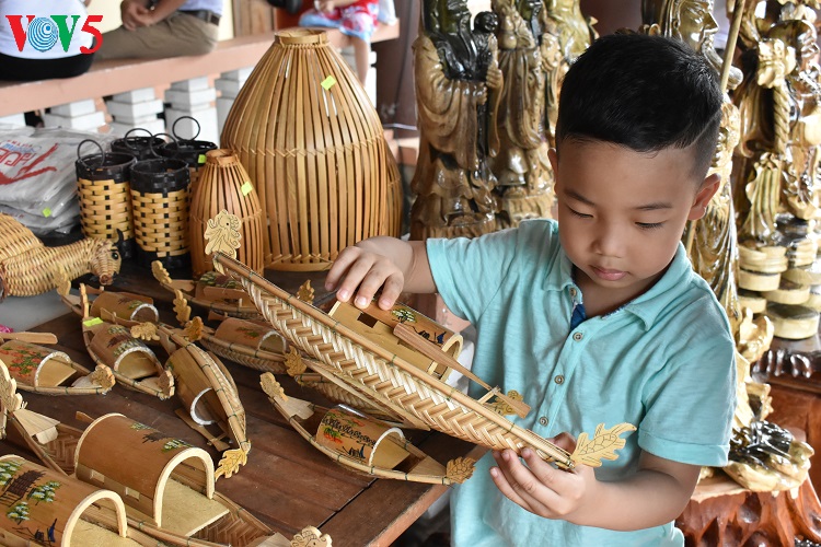 Khách du lịch tý hon thích thú với những món quà tặng lưu niệm làm bằng tre.