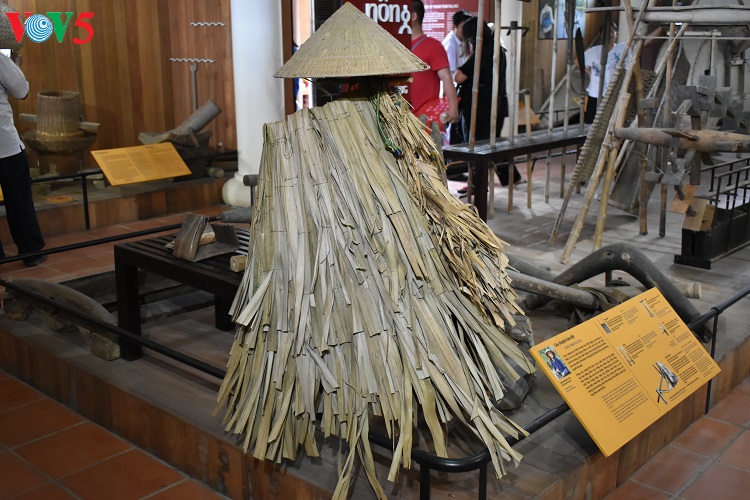 Trong không gian trưng bày các dụng cụ dành cho nhà nông, người xem được biết đến chiếc áo tơi để che mưa, che nắng của người nông dân xưa. Áo tơi thường được làm bằng lá cọ, lá giang.