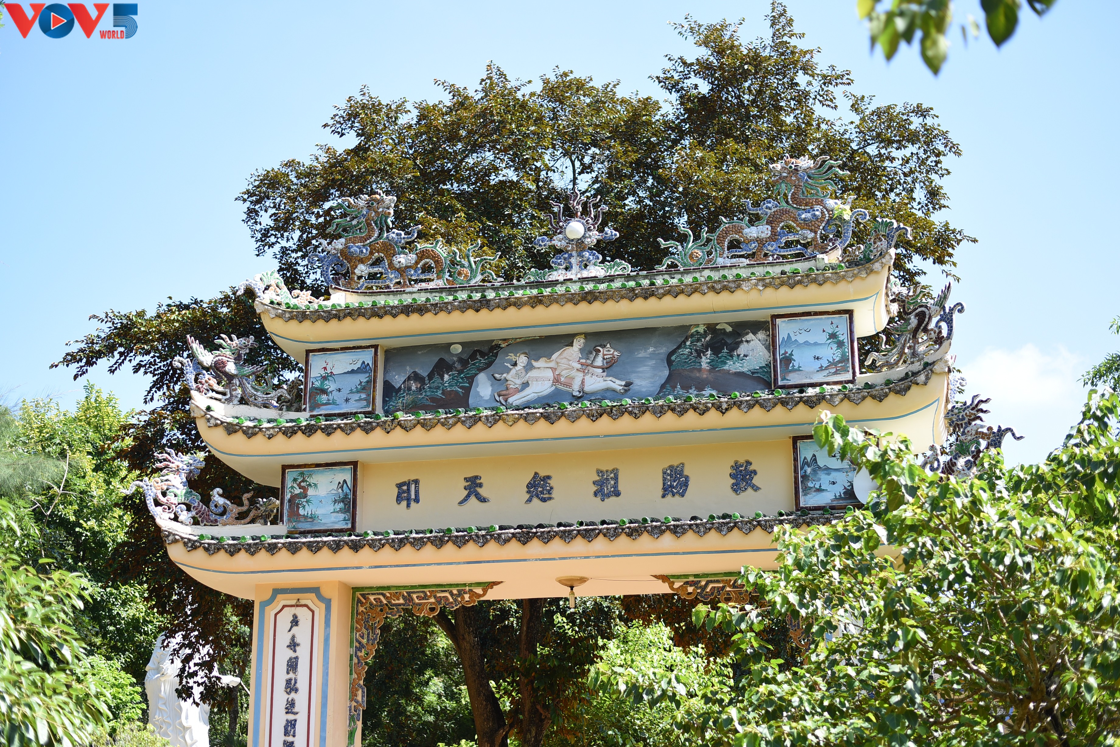 Từ chân cầu Trà Khúc, đi theo con đường về phía Cổ Lũy khoảng 2km, du khách sẽ gặp lối đi lên chùa Thiên Ấn. Chùa được khởi công xây dựng vào năm 1694 và hoàn thành vào cuối năm 1695. Ảnh tam quan chùa Thiên Ấn.