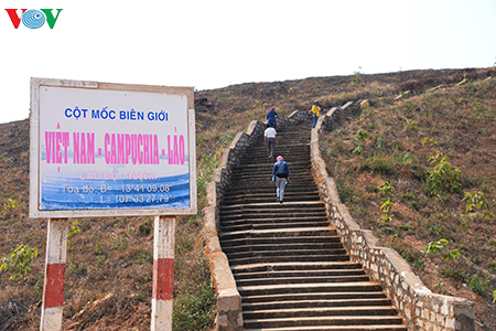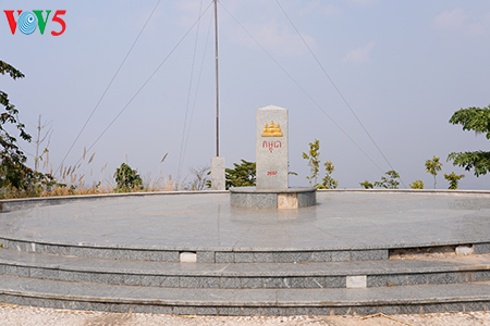 Cột mốc 3 mặt – 3 quốc gia nằm cách Ngã ba Đông Dương khoảng 10 cây số, trên một ngọn đồi cao 1.068m.