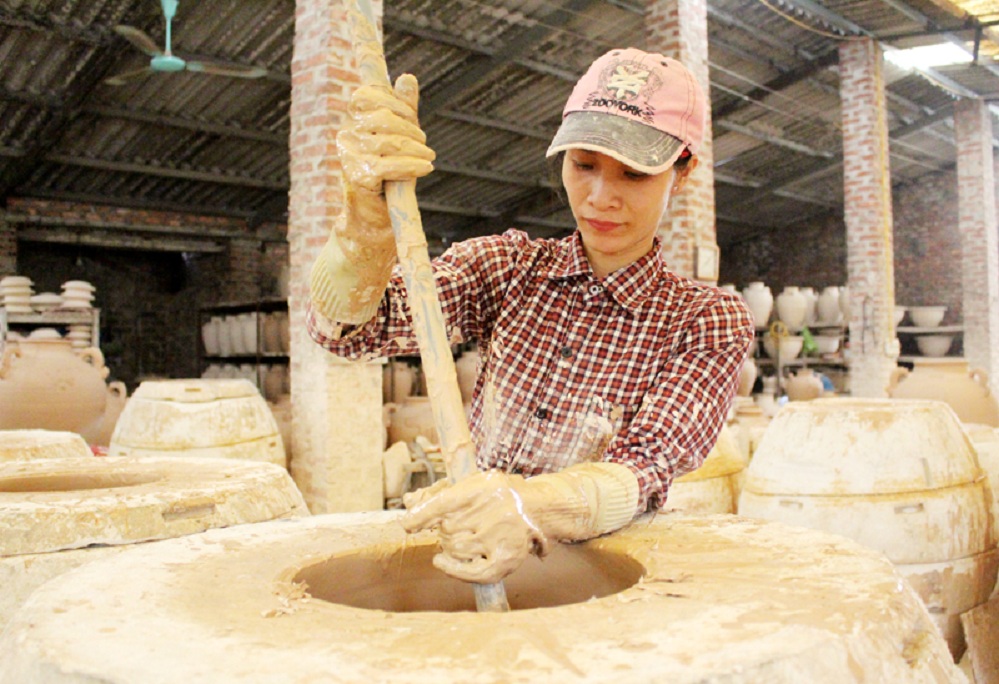 Các khâu làm đất, khuấy đất, đổ khuôn cho gốm đều được thực hiện gần như thủ công. Ảnh: baoquanhninh.com.vn
