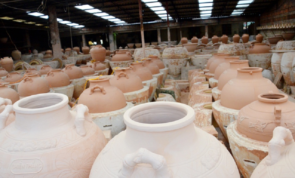 Đồ gốm, sứ, bát đĩa, chum sành, vại ở làng gốm Vĩnh Hồng. Ảnh: VOV