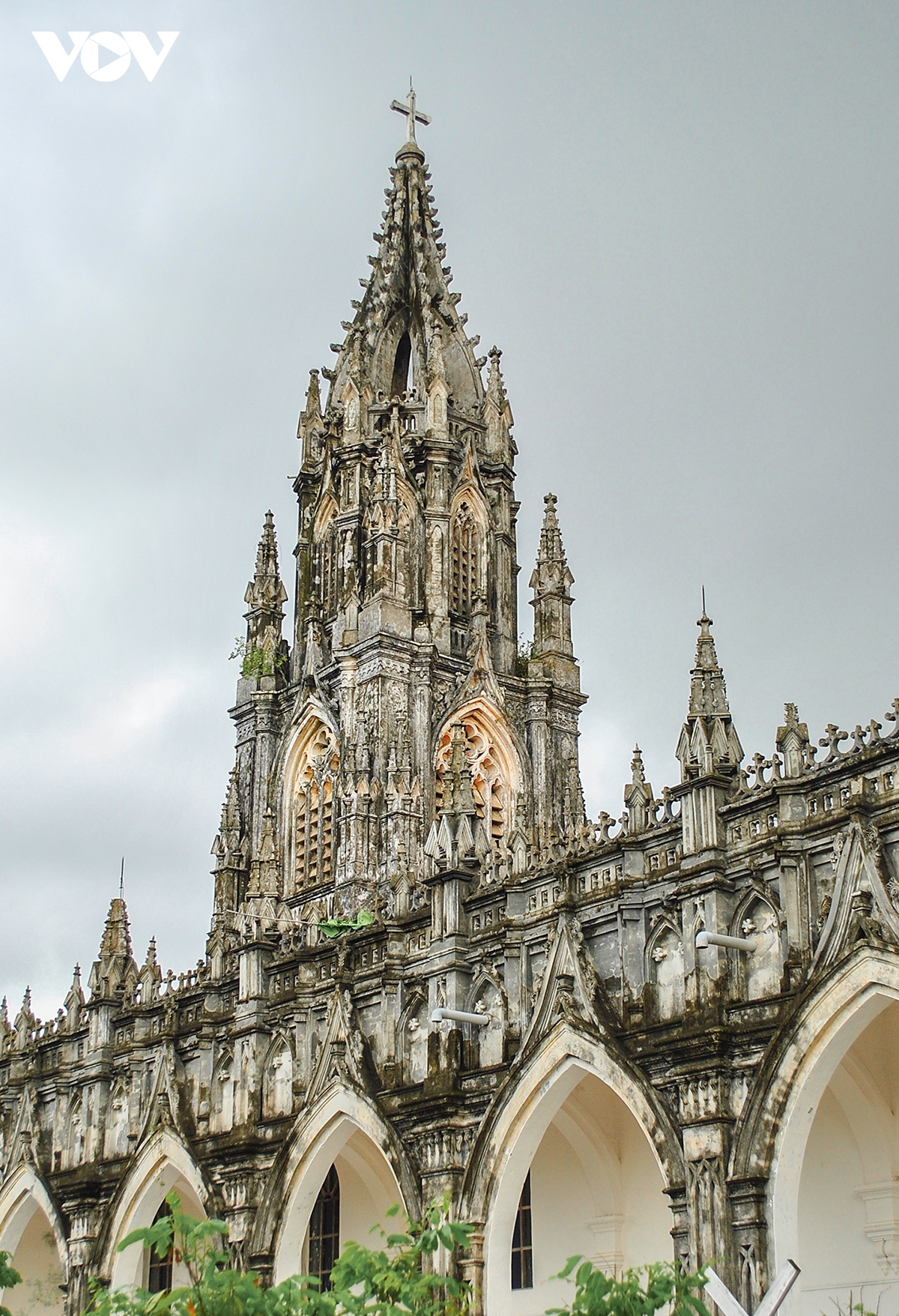 Nhà thờ trước đây có diện tích hơn 12.000 m2 mang nét trúc Gothic với nhiều mái vòm nhọn, hướng lên bầu trời. Mặt trước nhà thờ nhô lên với tháp chuông cao 36m, khung cửa hình vòm. Hai bên mái được gắn nhiều bức phù điêu (ảnh tư liệu chụp năm 2010). |