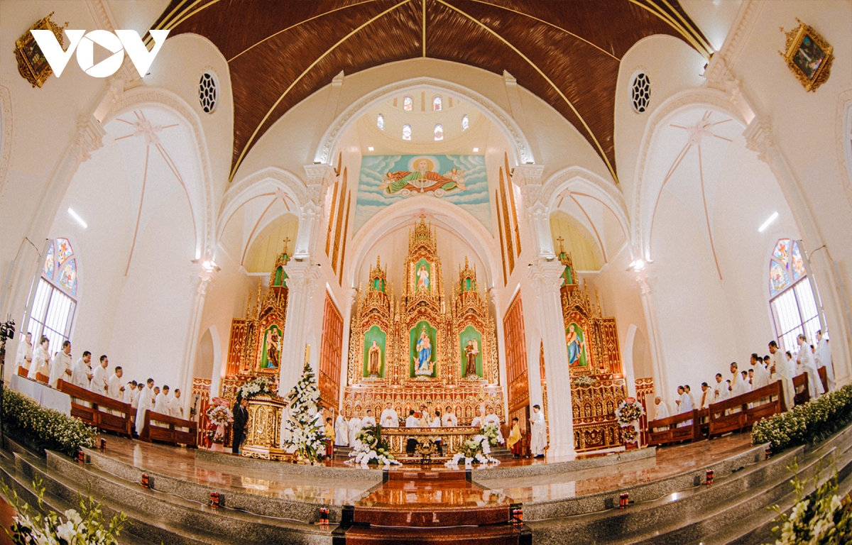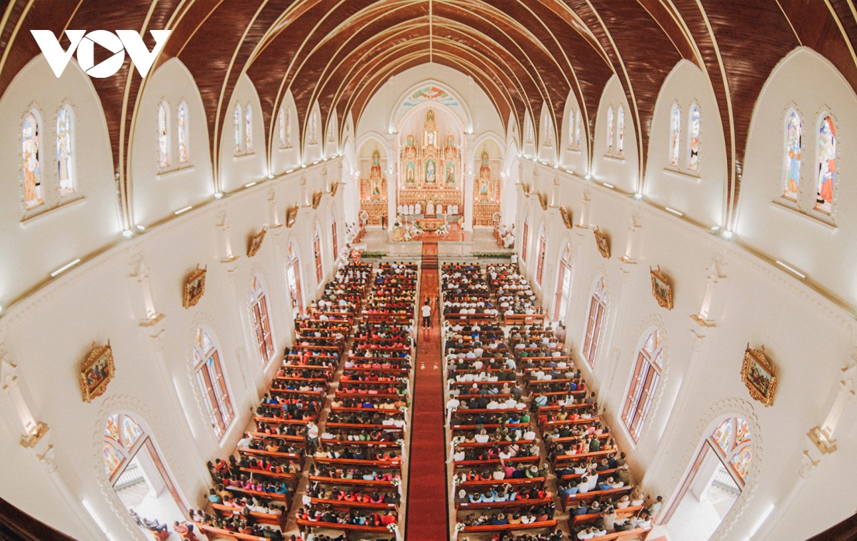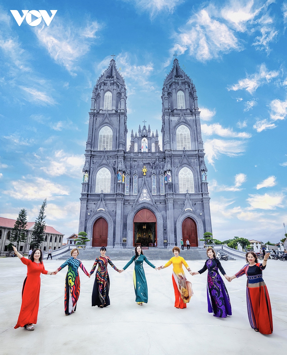 Nhà thờ mới tuy không còn “lớp áo” cổ kính như xưa nhưng vẫn giữ trọn vẹn những hoa văn, họa tiết đặc trưng của nhà thờ cũ. Công trình có quy mô đáp ứng nhu cầu sinh hoạt tôn giáo của hơn 1.100 giáo dân nơi đây. |