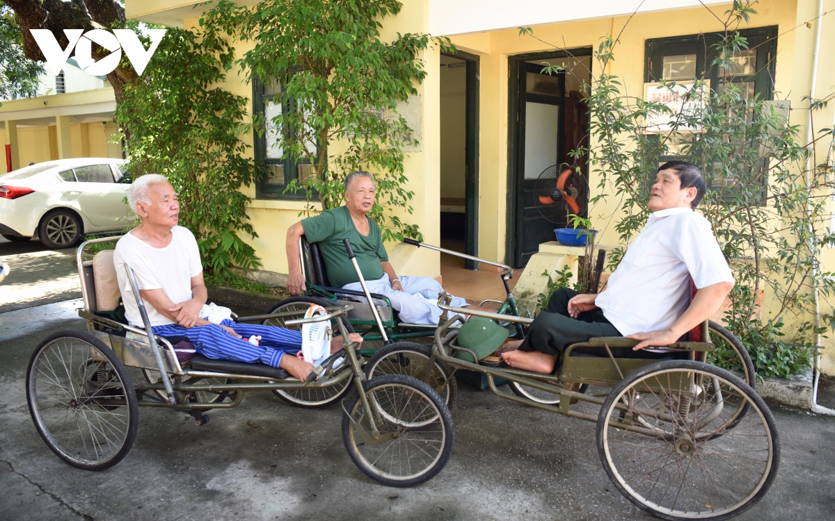 Vào thời gian rảnh rỗi, các thương, bệnh binh thường đẩy xe lăn ra chỗ cây rợp bóng mát giữa sân để hàn huyên, tâm sự cho vơi đi nỗi nhớ quê nhà. |