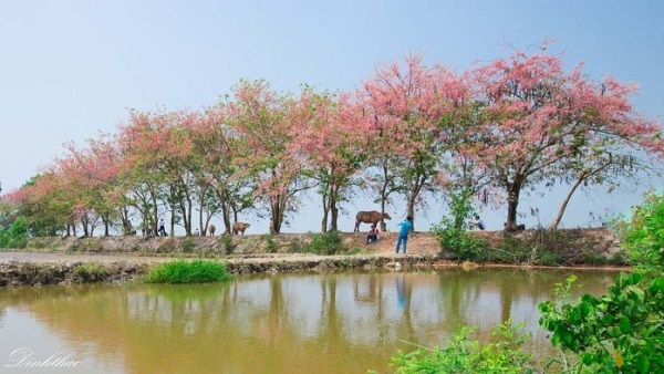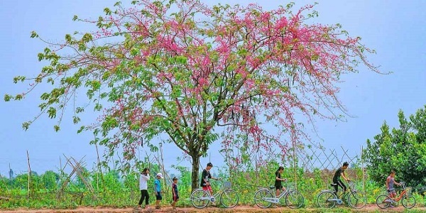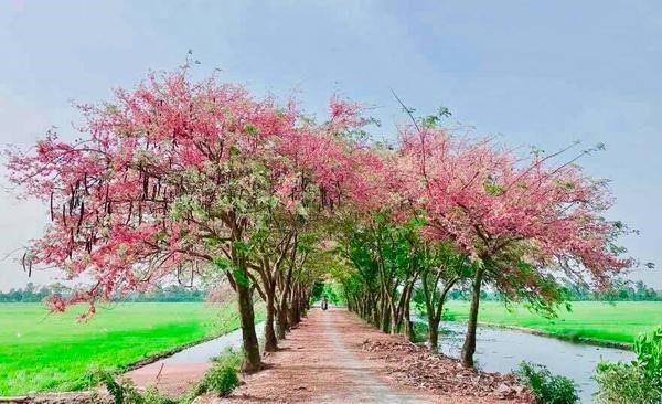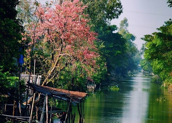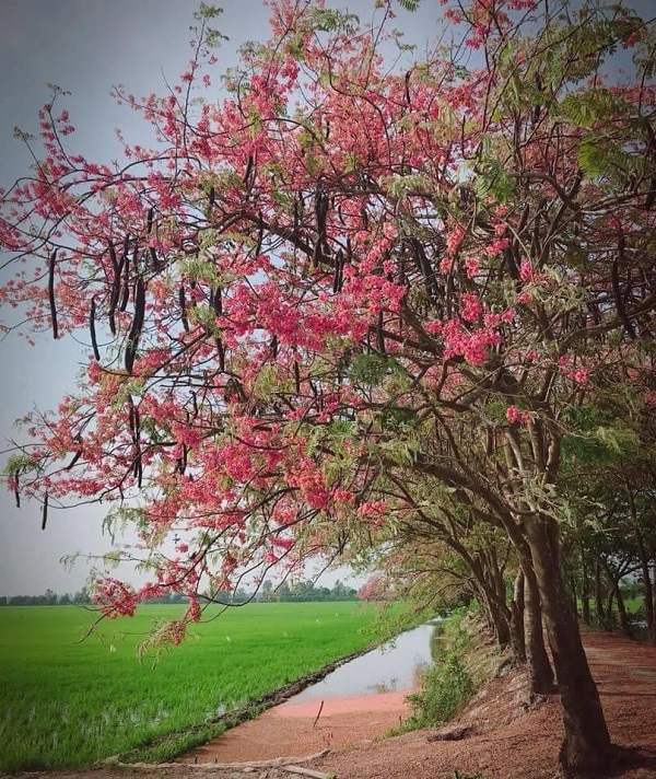 Khung cảnh làng quê Nam Bộ đẹp dịu dàng nhờ sắc hồng của hoa Ô Môi. Ảnh: kenhhomestay.com |