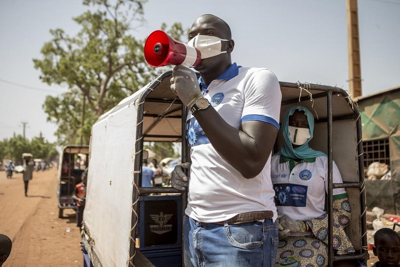 Kola Amadou Ba, 22 tuổi, đang chia sẻ thông điệp phòng chống COVID-19 ở vùng Mopti, Mali. Ảnh: UNICEF/UNI332870/Keïta