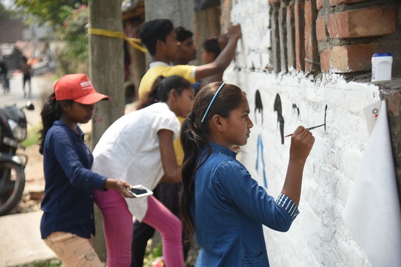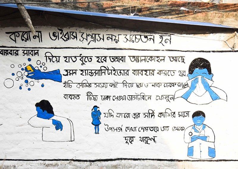 Các bạn trẻ vẽ tranh bích hoạ truyền tải thông điệp phòng tránh COVID-19 ở Kolkata, Ấn Độ. Ảnh: globalfundforchildren.org