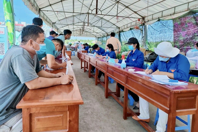 Đội hình “Thanh niên tình nguyện phòng, chống COVID-19” thực hiện lấy thông tin người dân từ địa phương khác trở về tỉnh Trà Vinh tại chốt cầu Cổ Chiên, huyện Càng Long. Ảnh: doanthanhnien.vn