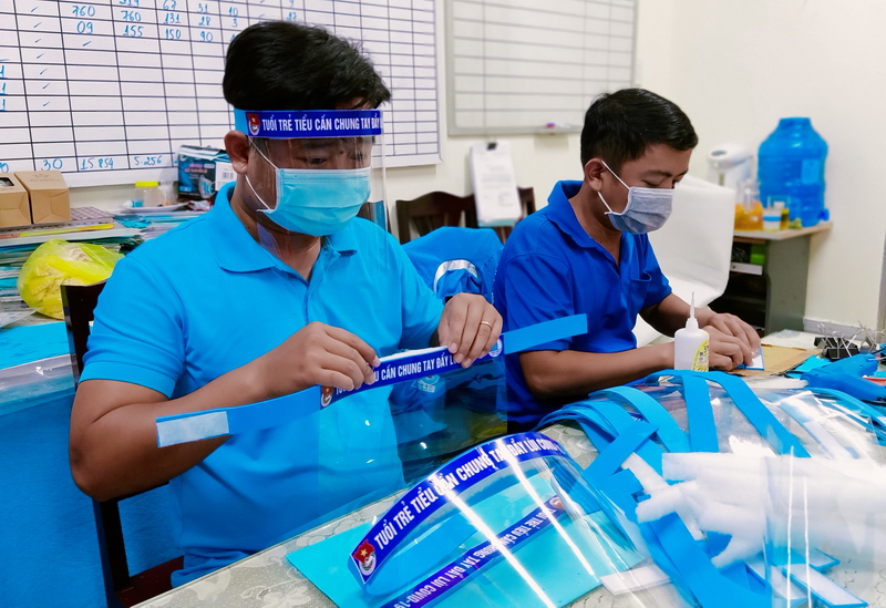 Thanh niên tình nguyện tỉnh Trà Vinh làm kính chắn giọt bắn phục vụ lực lượng tuần tra và trực chốt phòng, chống dịch. Ảnh: doanthanhnien.vn